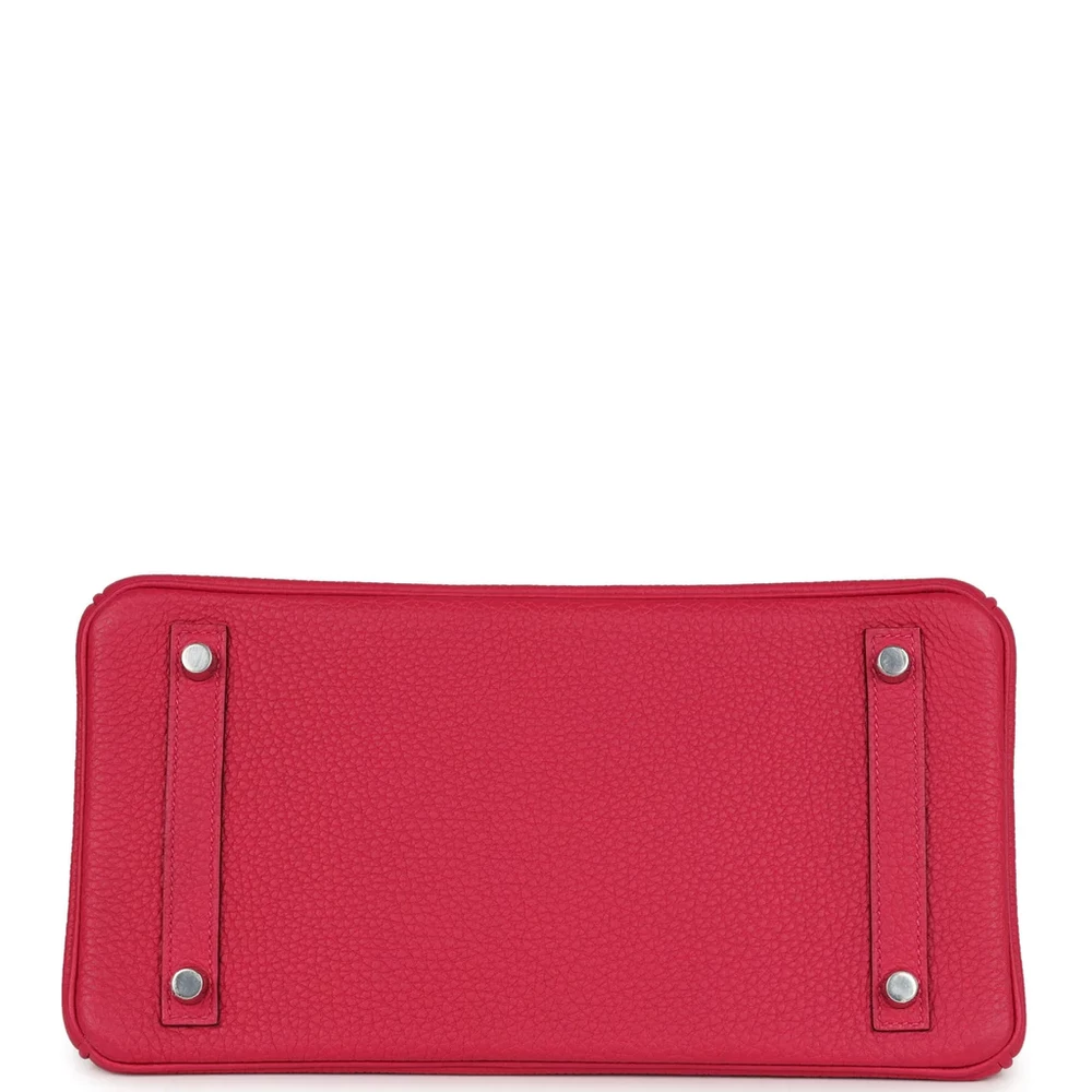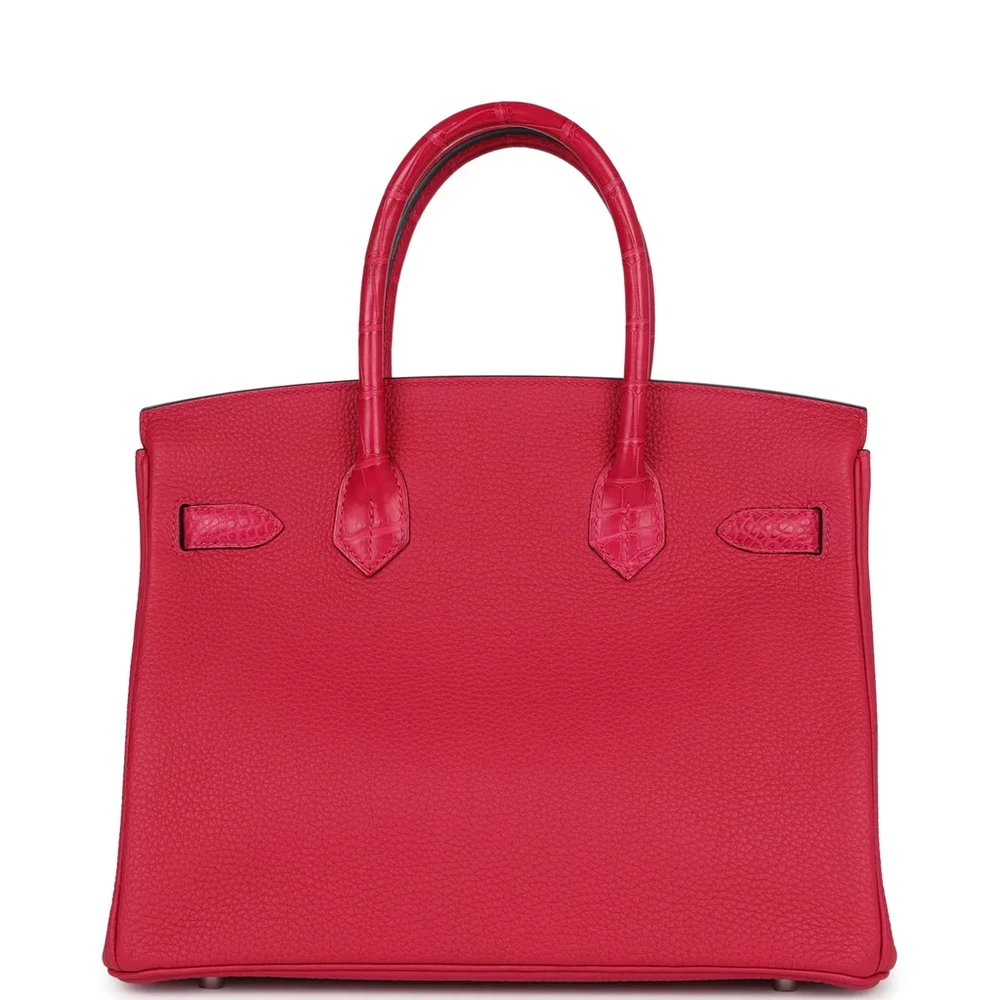 This Hermès Birkin is made from Rose Mexico Shiny Porosus Crocodile leather with palladium hardware, showcasing a vibrant and luxurious design. The bag features tonal stitching, a front strap, two straps with a center toggle closure, and a clochette with a lock and two keys for added security. The double rolled handles ensure comfort while carrying. The interior is lined with Rose Mexico Chevre leather, offering a smooth and luxurious finish. It includes one zip pocket with an Hermès engraved zipper pull and an open pocket on the opposite side for easy storage.