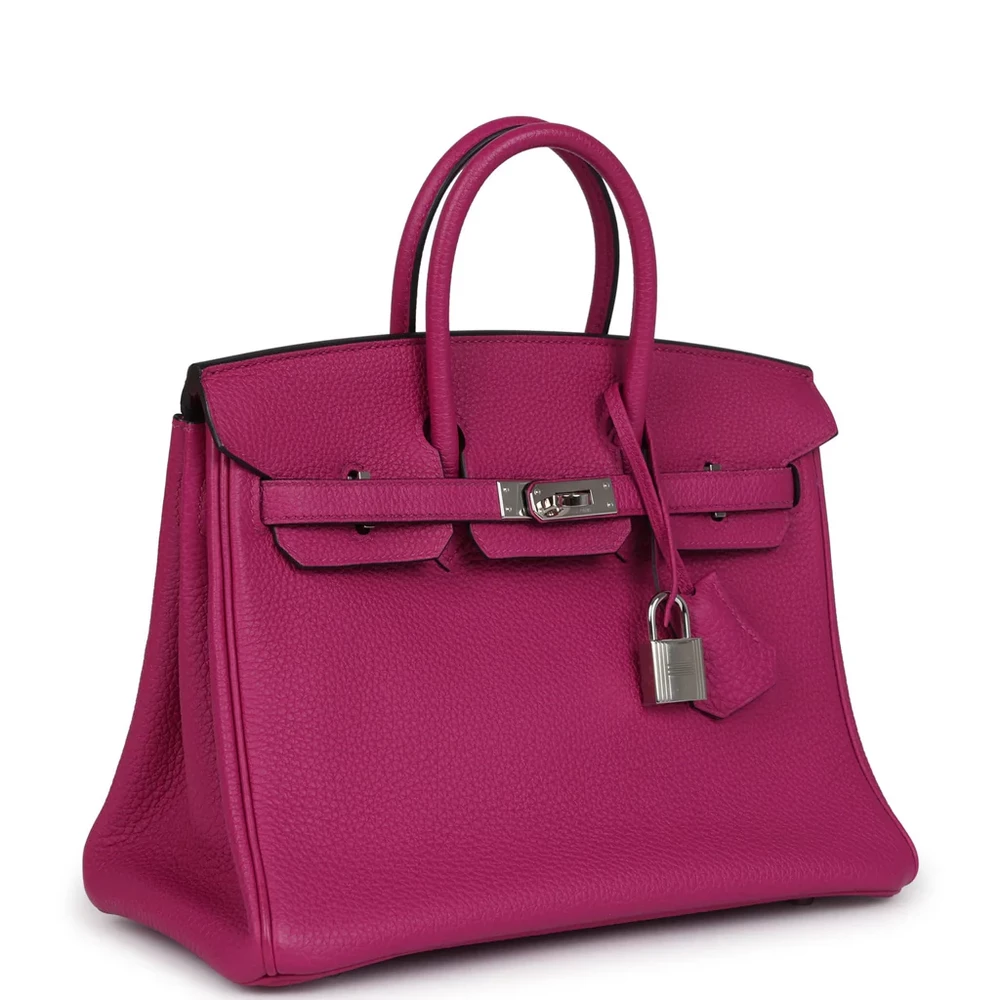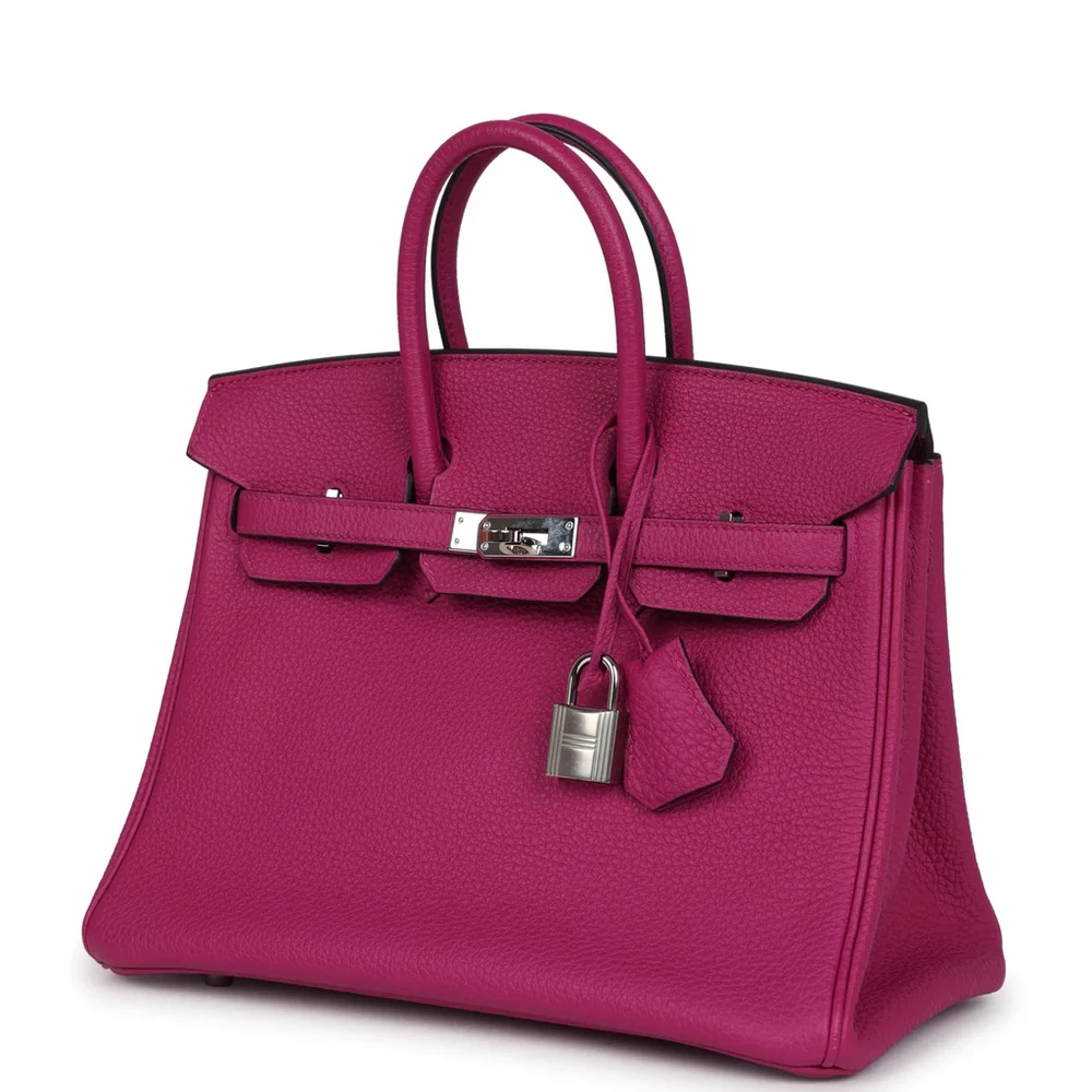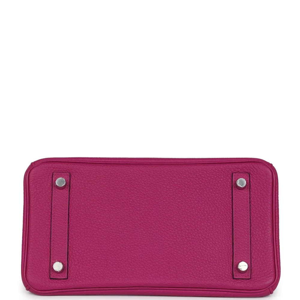 This Hermès Birkin is crafted from Rose Pourpre Togo leather with palladium hardware, providing a timeless and elegant look. The bag features tonal stitching, a front flap with two straps, and a center toggle closure for secure fastening. A clochette with a lock and two keys adds extra elegance, while the double rolled handles ensure comfortable carrying. The interior is lined with Rose Pourpre Chevre leather, offering a refined and smooth finish. It includes one zip pocket with an Hermès engraved zipper pull and an open pocket on the opposite side for convenient storage.