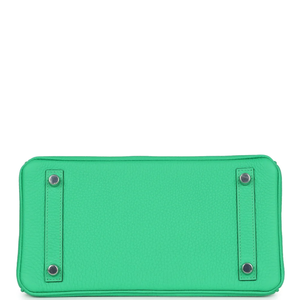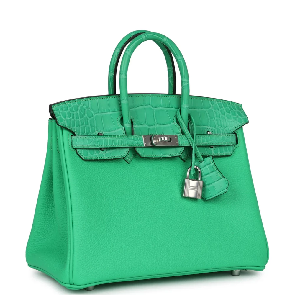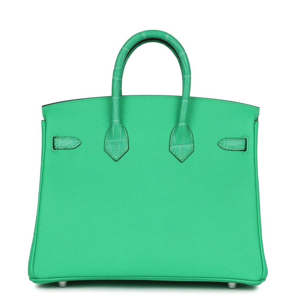 This Hermès Birkin is fashioned from Vert Comics Togo leather with matte alligator Mississippiensis touch accents and palladium hardware, featuring tonal stitching, a front flap with two straps, a center toggle closure, a clochette with lock and two keys, and double rolled handles. The interior is lined with Vert Comics chèvre leather and includes one zip pocket with an Hermès-engraved zipper pull and an open pocket on the opposite side.