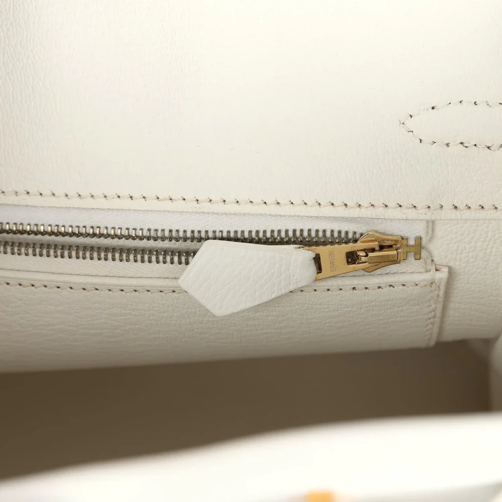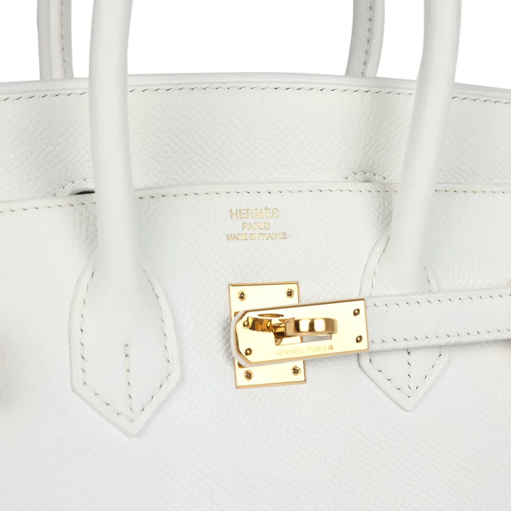 This Hermès Birkin is made of White Epsom leather with gold hardware. It boasts tonal stitching and a front flap with two straps, as well as a front toggle closure. A clochette with a lock and two keys are included, along with double rolled handles. Inside, the bag is lined with White Chevre leather, featuring one zip pocket with an Hermès engraved zipper pull and an open pocket on the opposite side for added convenience.