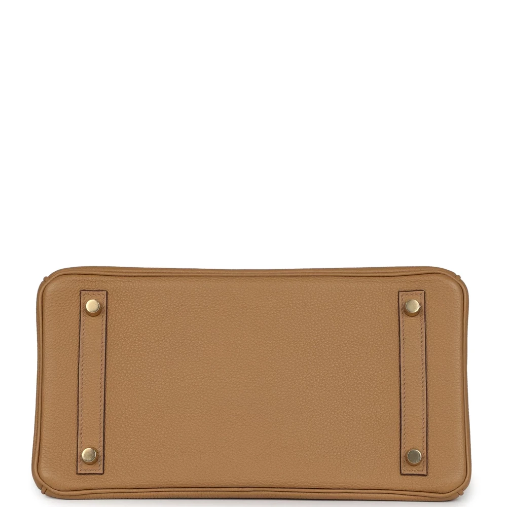 This Hermès Birkin is made from Biscuit Togo leather with gold hardware, showcasing tonal stitching, a front flap with two straps and a center toggle closure, a clochette with lock and two keys, and double rolled handles. The interior is lined with Biscuit chèvre leather and offers one zip pocket with an Hermès-engraved zipper pull and an open pocket on the opposite side.