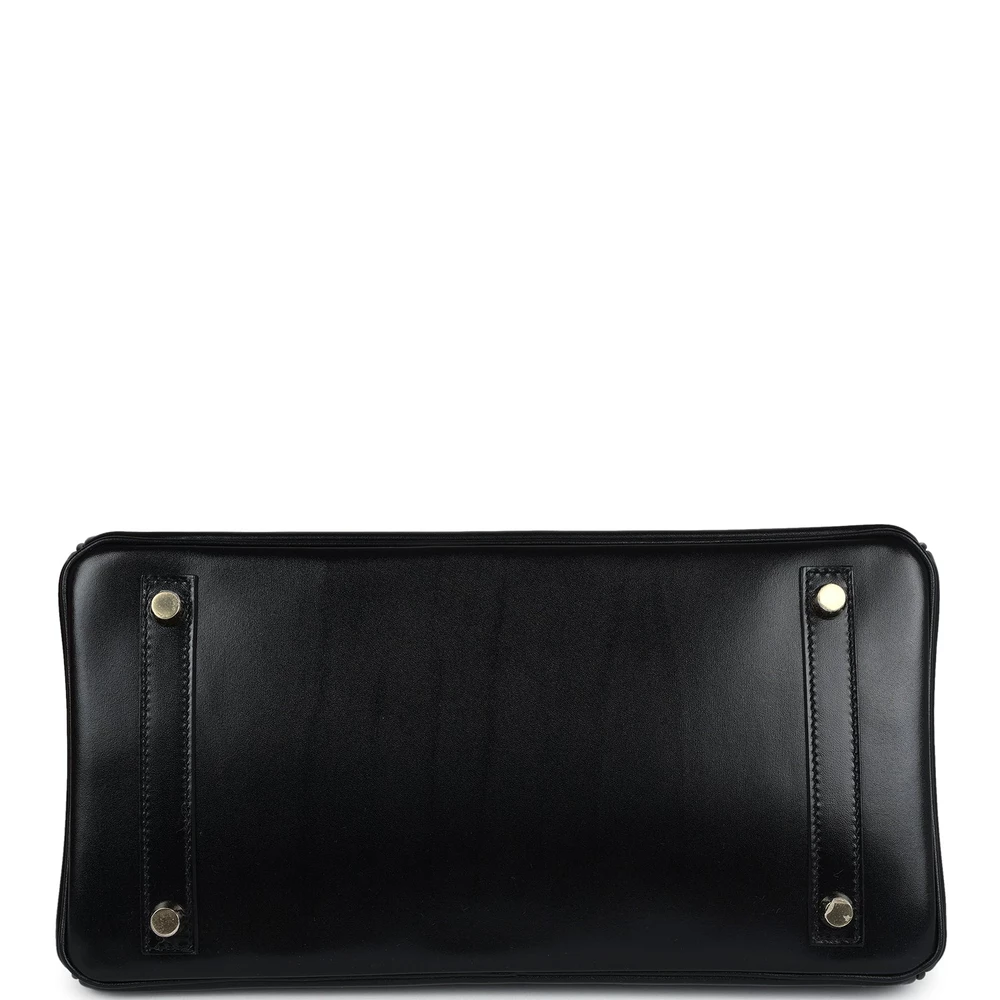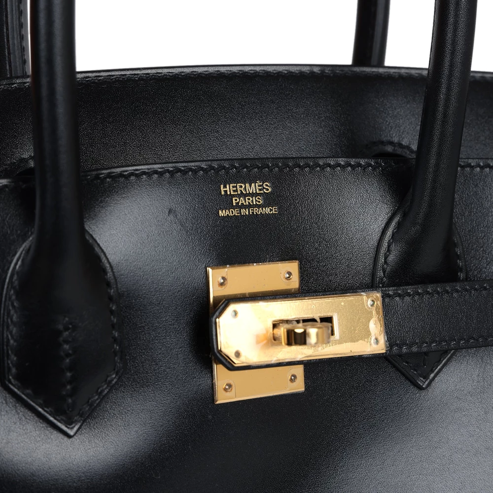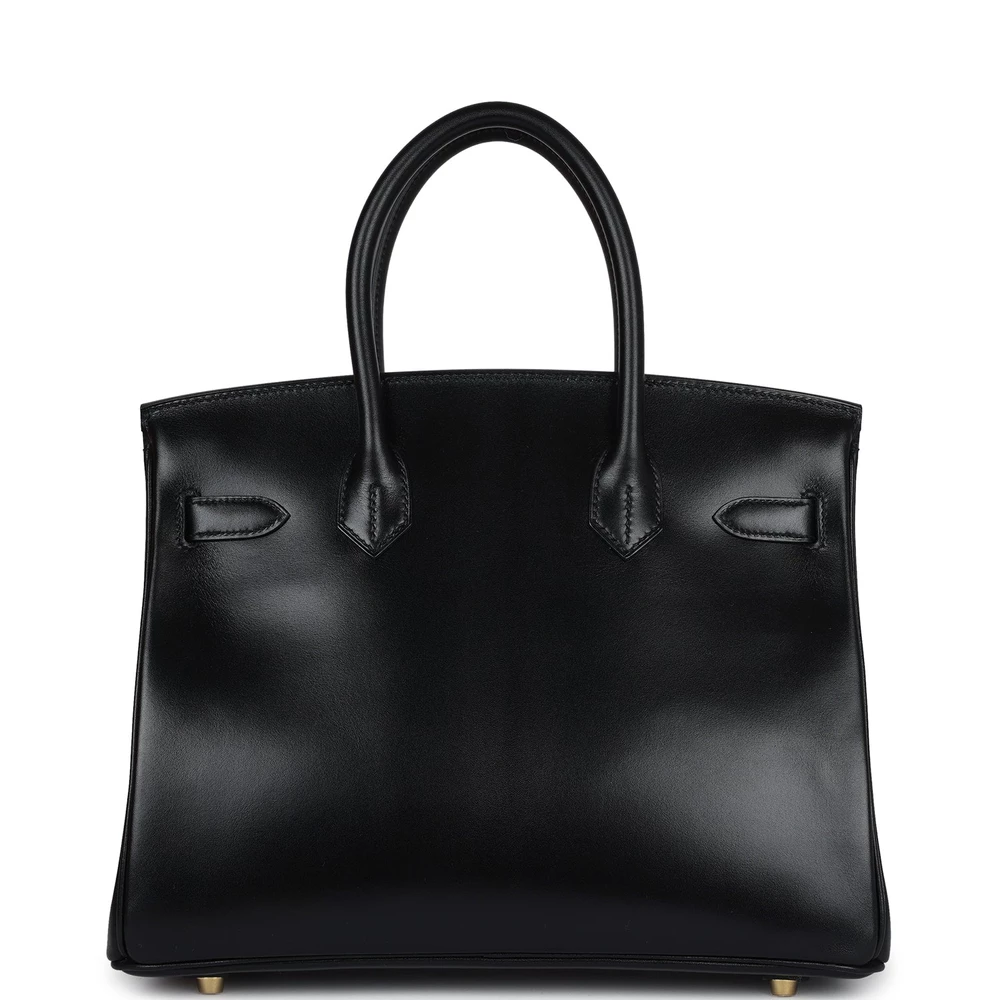This Hermès Birkin 30 is crafted from black Boxcalf leather with gold hardware, featuring tonal stitching, a front flap with two straps and a center toggle closure, a clochette with lock and two keys, and double rolled handles. The interior is lined with black chèvre leather and includes one zip pocket with an Hermès engraved zipper pull and an open pocket on the opposite side. The smooth Boxcalf leather adds a sophisticated and polished finish to this 30 cm Birkin. The gold hardware provides a beautiful contrast against the deep black leather. This elegant bag is perfect for a variety of occasions.