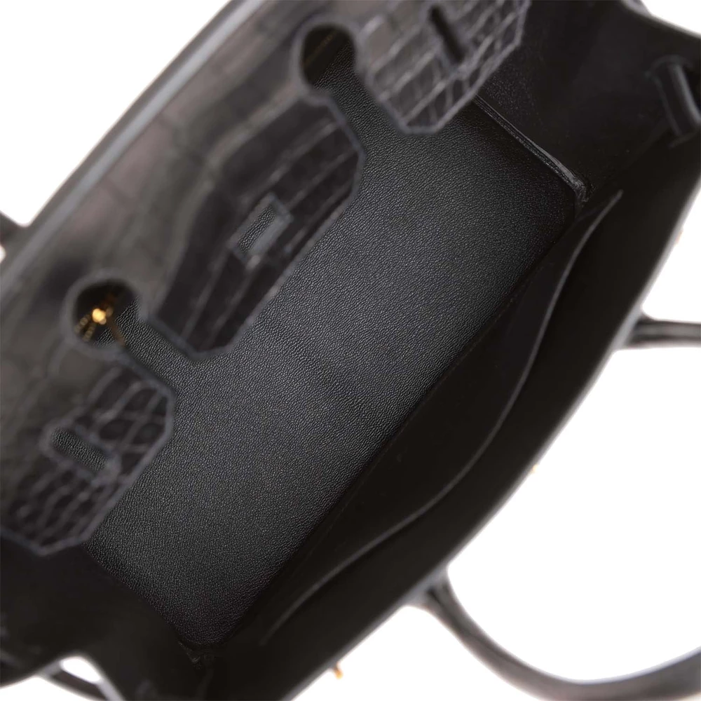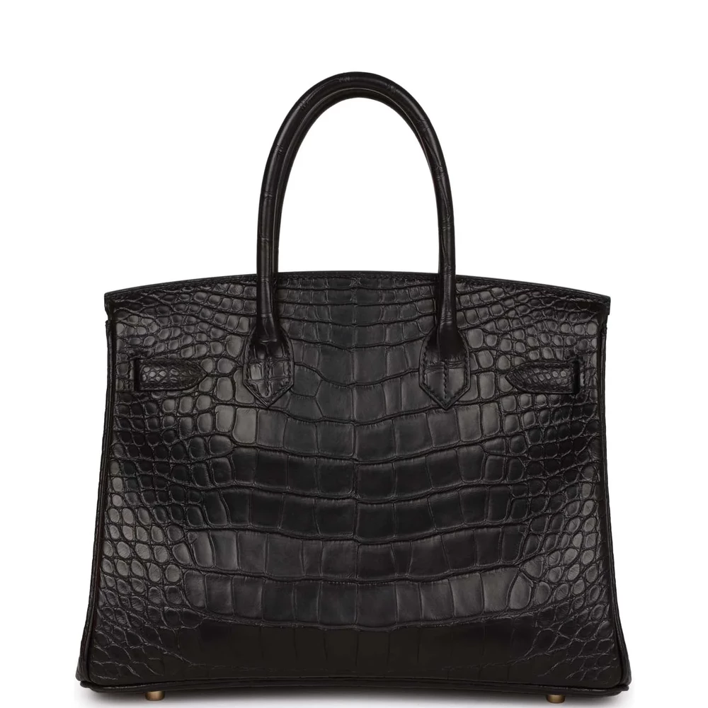 This Hermès Birkin 30 is crafted from black matte alligator leather with gold hardware, featuring tonal stitching, a front flap with two straps and a center toggle closure, a clochette with lock and two keys, and double rolled handles. The interior is lined with black chèvre leather and includes one zip pocket with an Hermès engraved zipper pull and an open pocket on the opposite side. The matte alligator leather offers an exotic, understated elegance. The gold hardware complements the luxurious texture of the leather. This 30 cm Birkin is ideal for both formal and casual occasions.