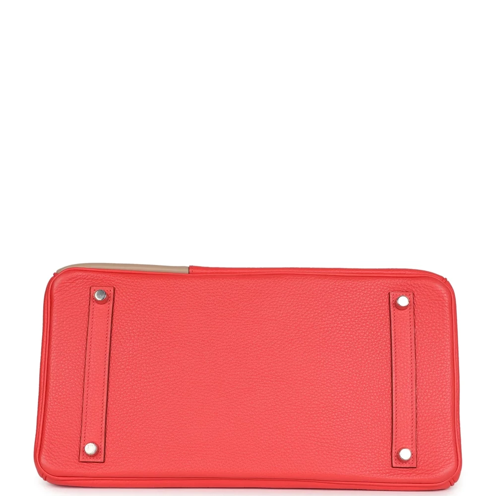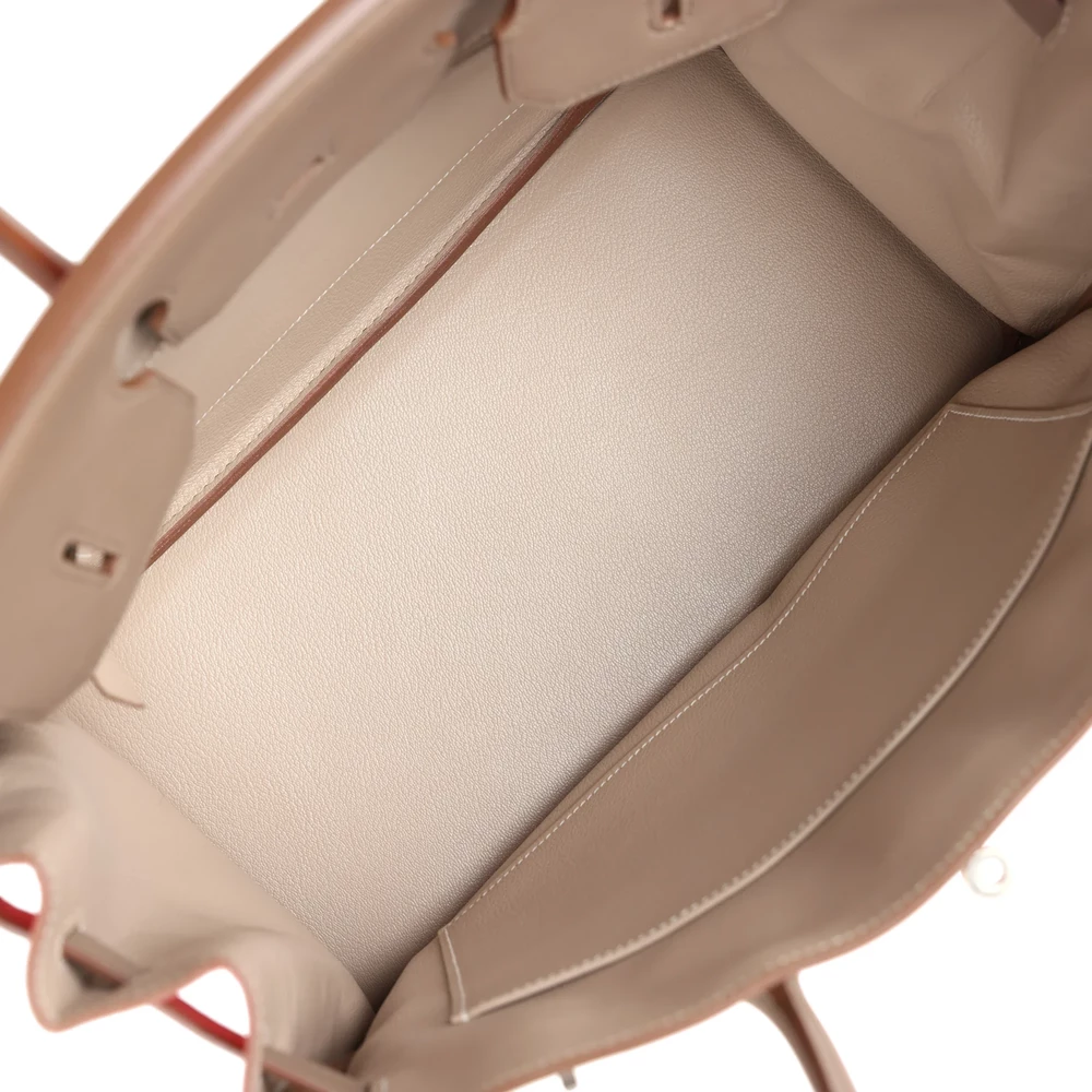 This Hermès unique Birkin showcases a cascade of Rose Jaipur, Etoupe, and Argile hues in Swift and Clemence leathers, accented by brushed palladium hardware. It features contrast stitching, a front flap with two straps and a center toggle closure, a clochette with lock and two keys, and double rolled handles. The interior is lined with Argile chèvre leather and offers one zip pocket with an Hermès-engraved zipper pull and an open pocket on the opposite side. The combination of these rich hues creates a striking and elegant look. The brushed palladium hardware adds a modern touch to the classic design. The spacious interior ensures ample room for your belongings.