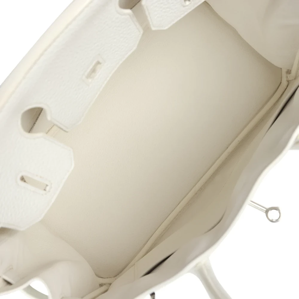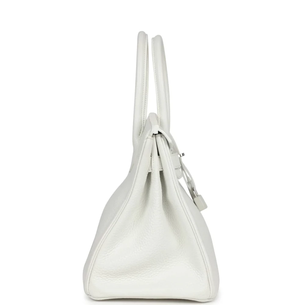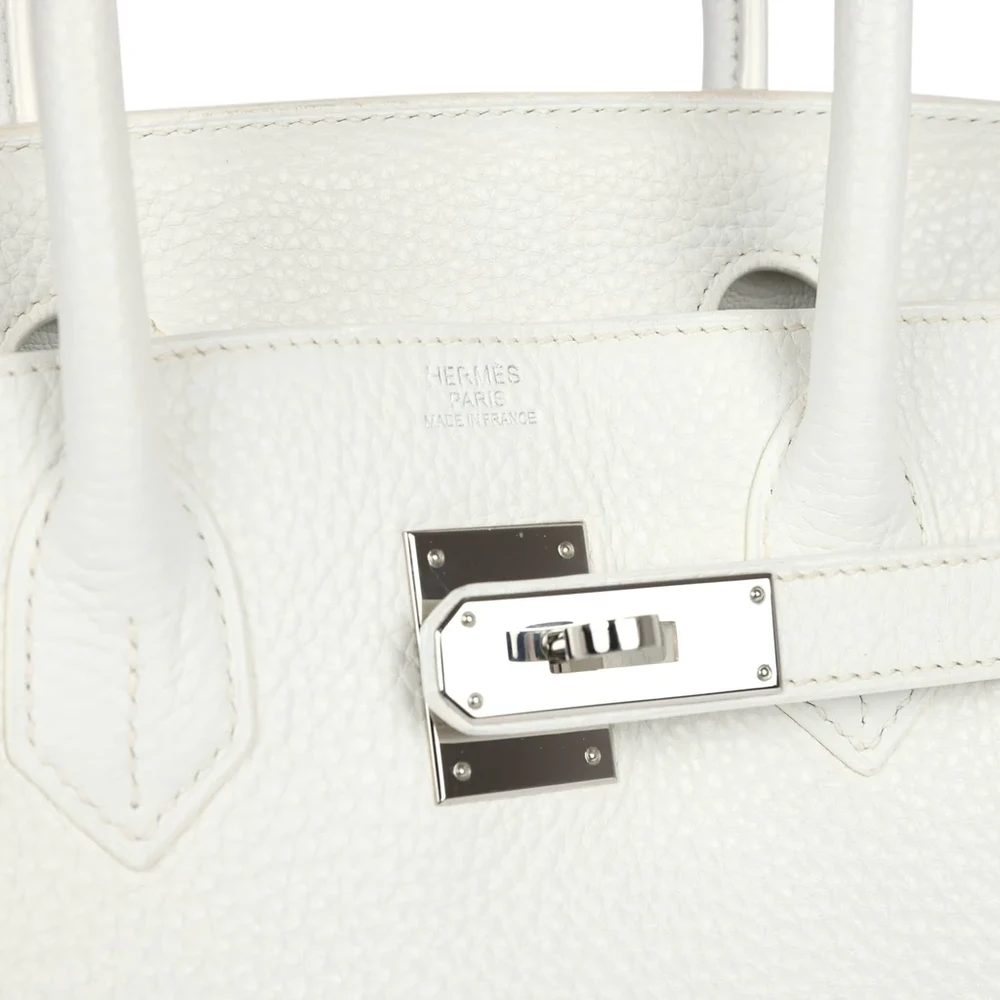 This Hermès Birkin is crafted from White Clemence leather with palladium hardware. It features tonal stitching and a front toggle closure, along with a clochette with a lock and two keys for added security. The double rolled handles ensure a comfortable grip. Inside, the bag is lined with White Chevre leather, with one zip pocket featuring an Hermès engraved zipper pull and an open pocket on the opposite side for extra organization.