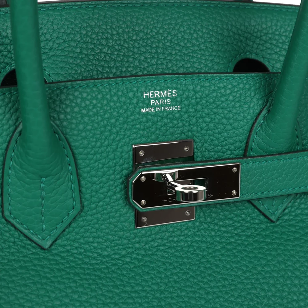 This Hermès Verso Birkin is made from Vert Vertigo Clemence leather with palladium hardware, showcasing tonal stitching, a front flap with two straps, a center toggle closure, a clochette with lock and two keys, and double rolled handles. The interior is lined with Vert Foncé chèvre leather and offers one zip pocket with an Hermès-engraved zipper pull and an open pocket on the opposite side.