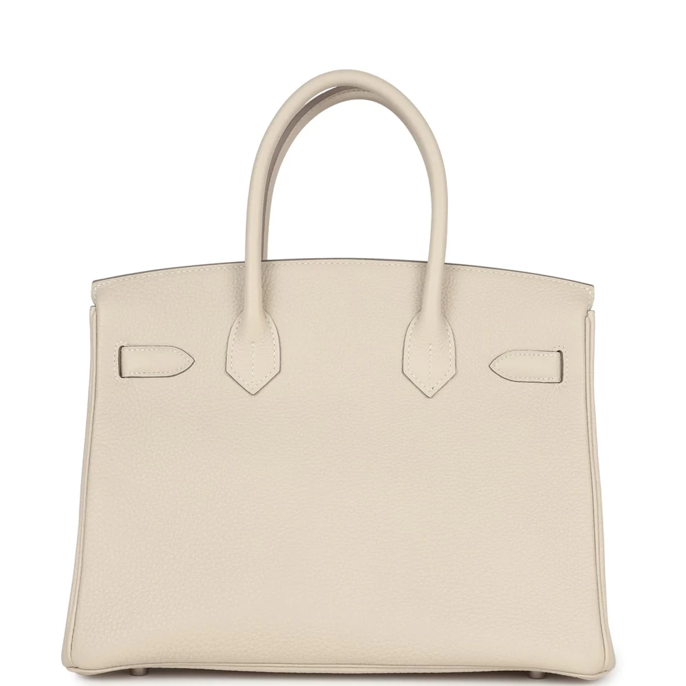 This Hermès Birkin 30 is crafted from Craie Togo leather with palladium hardware, featuring tonal stitching, a front flap with two straps and a center toggle closure, a clochette with lock and two keys, and double rolled handles. The interior is lined with Craie chèvre leather and includes one zip pocket with an Hermès engraved zipper pull and an open pocket on the opposite side. The Craie leather gives this Birkin a soft and creamy look. The 30 cm size is versatile, offering enough space for your essentials. The palladium hardware adds a modern touch to this classic design.