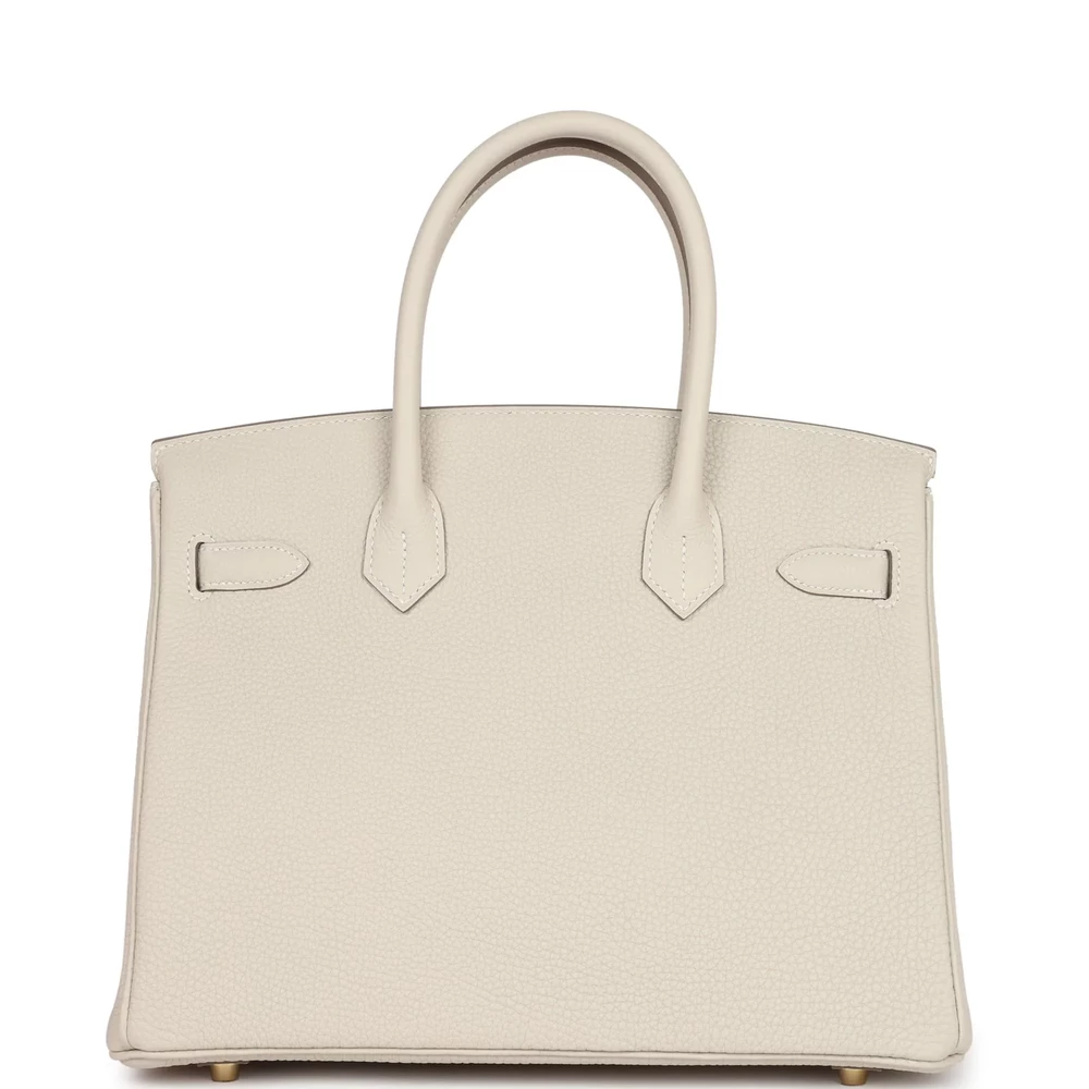 This Hermès Birkin 30 is made from Craie Togo leather with gold hardware. It showcases tonal stitching, a front flap with two straps and a center toggle closure, a clochette with lock and two keys, and double rolled handles. The interior is lined with Craie chèvre leather and offers one zip pocket with an Hermès engraved zipper pull and an open pocket on the opposite side. The soft and creamy Craie leather gives this Birkin a refined and elegant appearance. The 30 cm size is perfect for everyday use, offering just the right amount of space for essentials. The gold hardware adds a touch of luxury to the overall design.