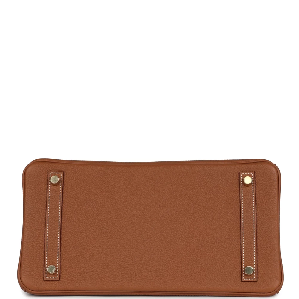 This Hermès Birkin is designed in Gold Togo leather with gold hardware. It includes contrast stitching, a front flap with two straps and a center toggle closure, a clochette with lock and two keys, and double rolled handles. The interior is lined with Gold chèvre leather and has one zip pocket with an Hermès-engraved zipper pull and an open pocket on the opposite side. The Togo leather gives the bag a soft, supple texture that improves with age. Gold hardware adds a rich, timeless appeal to this already stunning piece. Its spacious interior makes it ideal for both work and weekend outings.