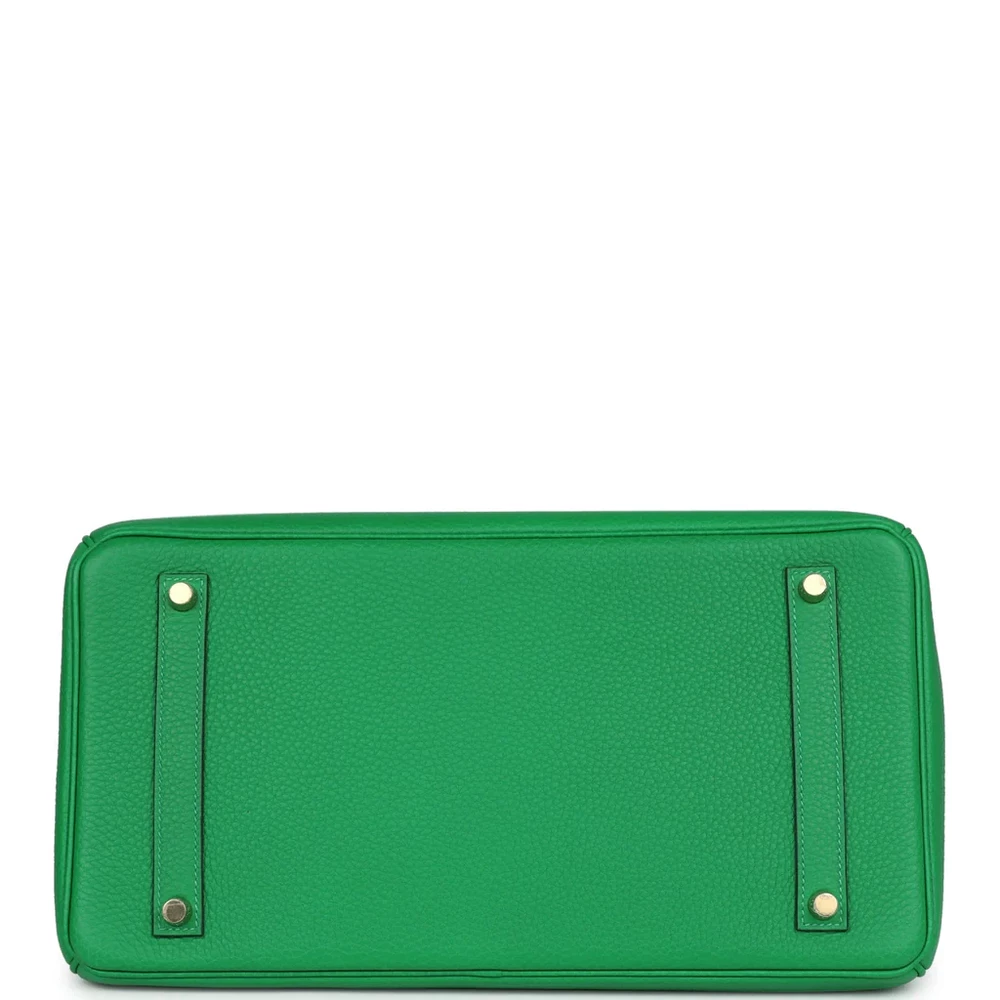 This Hermès Birkin is made from Bambou Clemence leather with gold hardware, showcasing tonal stitching, a front flap with two straps and a center toggle closure, a clochette with lock and two keys, and double rolled handles. The interior is lined with Bambou chèvre leather and offers one zip pocket with an Hermès-engraved zipper pull and an open pocket on the opposite side.