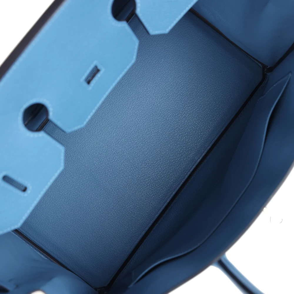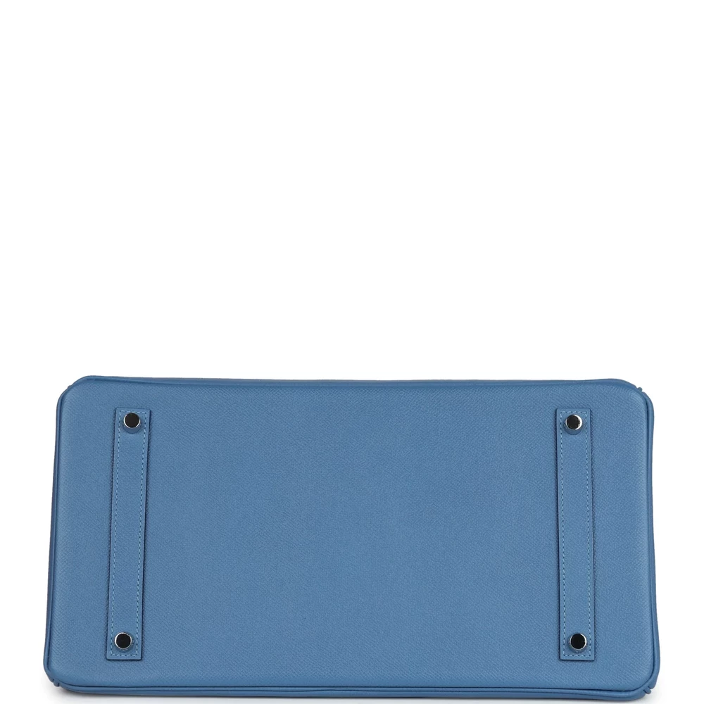 This Hermès Birkin 35 is made from Bleu Azur Epsom leather with palladium hardware, showcasing tonal stitching, a front flap with two straps and a center toggle closure, a clochette with lock and two keys, and double rolled handles. The interior is lined with matching chèvre leather and offers one zip pocket with an Hermès engraved zipper pull and an open pocket on the opposite side. The cool and refreshing Bleu Azur leather gives this Birkin a sophisticated, calm appeal. The Epsom leather is known for its durability and structured look. The 35 cm size offers plenty of room for your essentials.