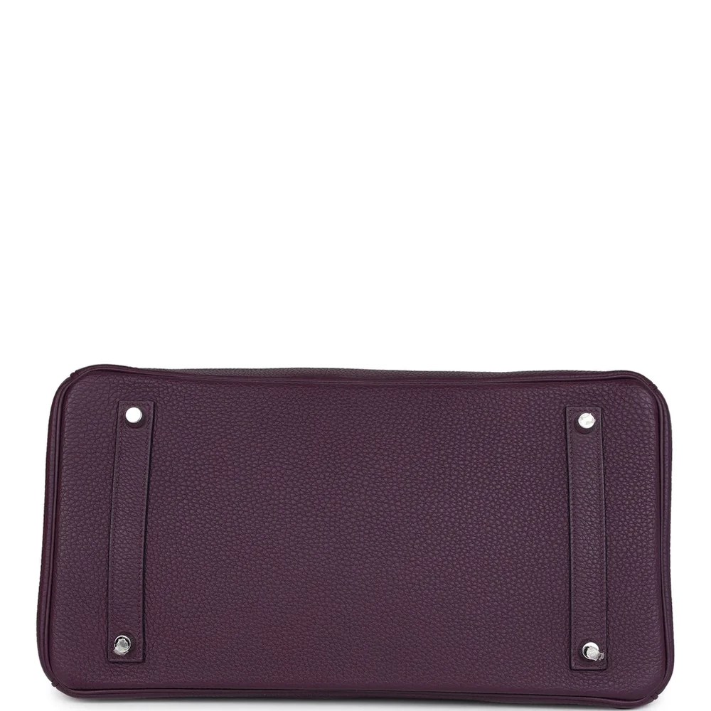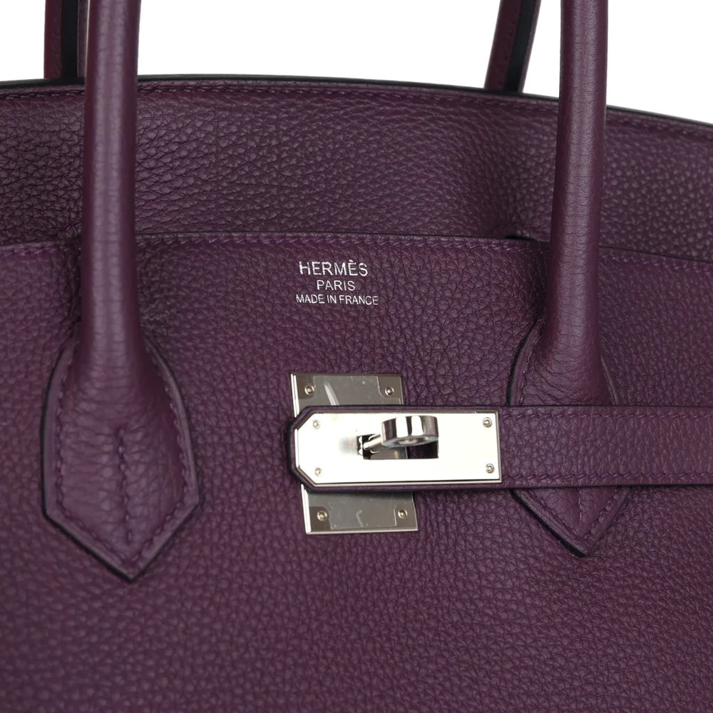 This Hermès Birkin is crafted from Cassis Togo leather with palladium hardware, providing a striking and sophisticated design. The bag features tonal stitching, a front flap with two straps, and a center toggle closure for secure fastening. A clochette with a lock and two keys enhances the bag’s elegance, while the double rolled handles ensure comfort. The interior is lined with Cassis Chevre leather, offering a smooth and luxurious touch. It includes one zip pocket with an Hermès engraved zipper pull and an open pocket on the opposite side for easy access.