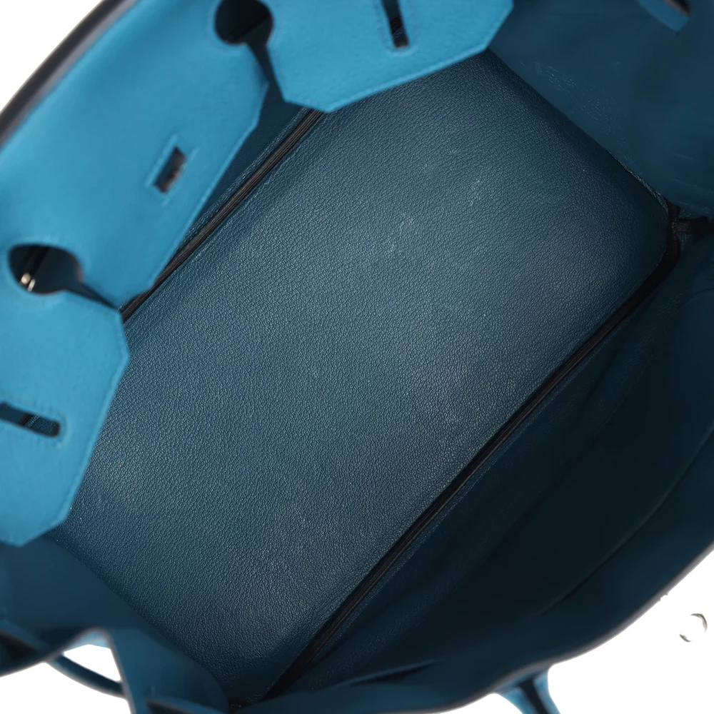 This Hermès Birkin is crafted from Cobalt Togo leather with palladium hardware, featuring tonal stitching, a front flap with two straps and a center toggle closure, a clochette with lock and two keys, and double rolled handles. The interior is lined with Cobalt chèvre leather and includes one zip pocket with an Hermès-engraved zipper pull and an open pocket on the opposite side.