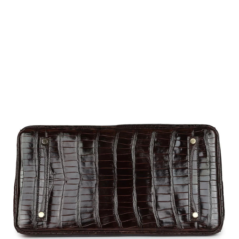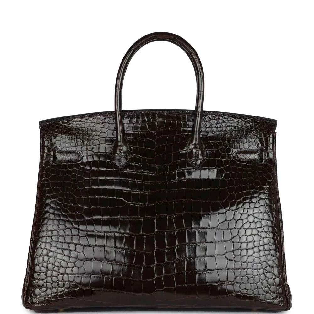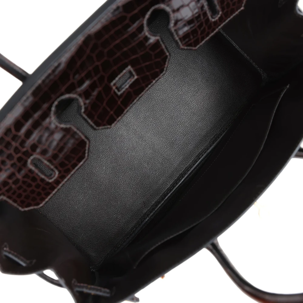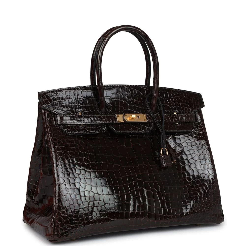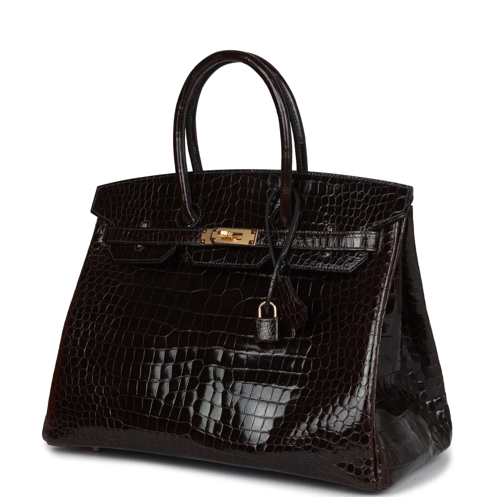 This Hermès Birkin 35 is constructed from Cocaon shiny Porosus crocodile leather with gold hardware, featuring tonal stitching, a front flap with two straps and a center toggle closure, a clochette with lock and two keys, and double rolled handles. The interior is lined with Cocaon chèvre leather and includes one zip pocket with an Hermès engraved zipper pull and an open pocket on the opposite side. The shiny Porosus crocodile leather gives this Birkin an exceptional look, while the gold hardware adds warmth and sophistication. The 35 cm size offers plenty of room while maintaining a sleek silhouette. This Birkin is both a fashion statement and a functional accessory. Its luxurious material and craftsmanship make it a coveted collector’s item.