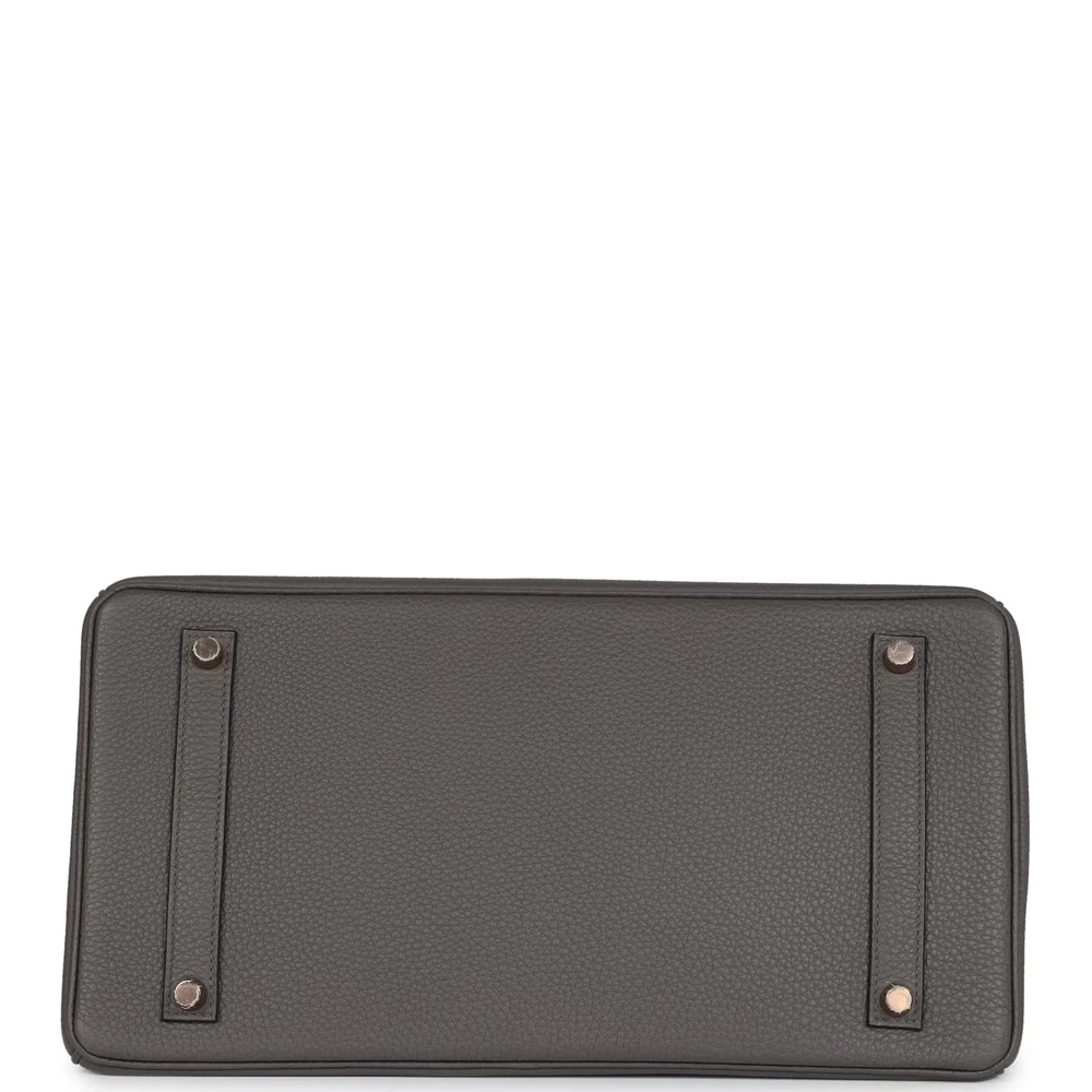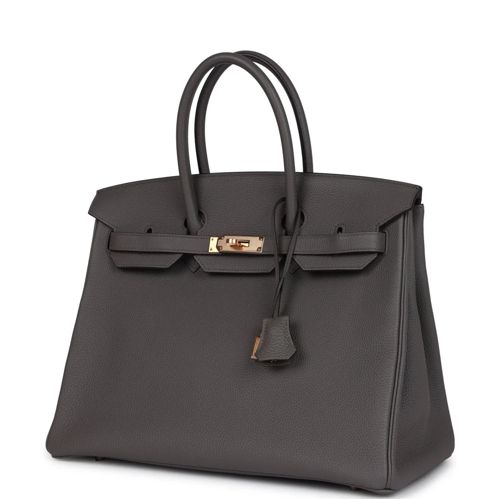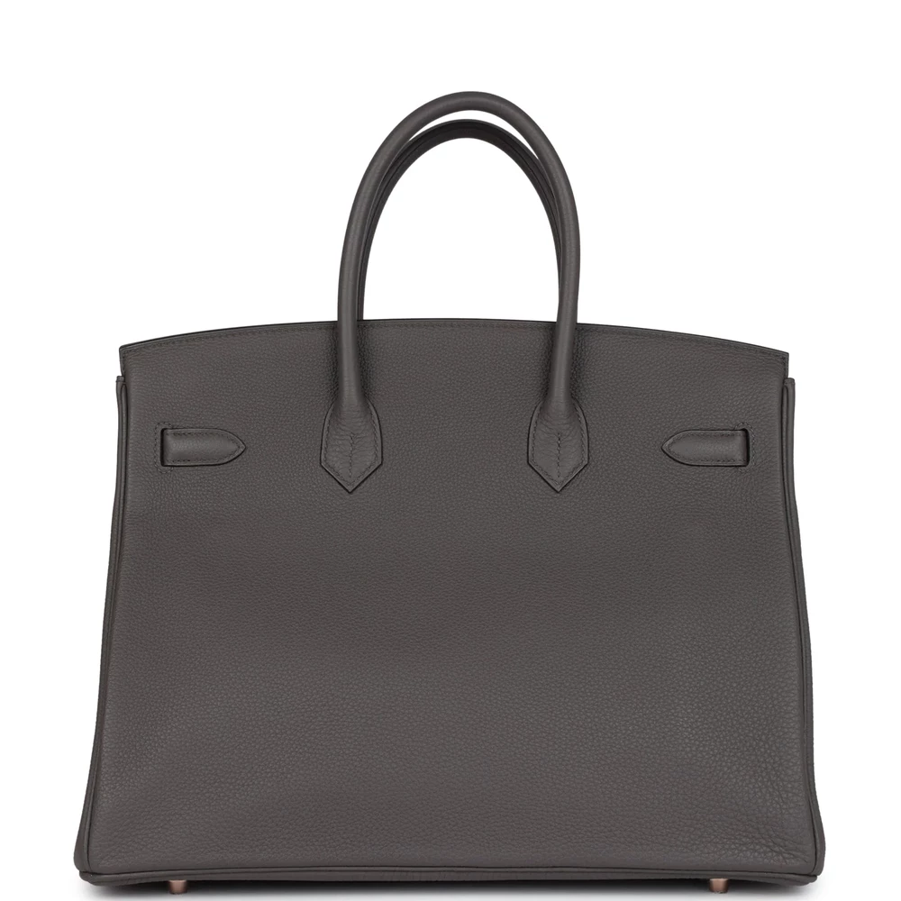 This Hermès Birkin 35 is constructed from Etain Togo leather with rose gold hardware, featuring tonal stitching, a front flap, two straps with a center toggle closure, a clochette with lock and two keys, and double rolled handles. The interior is lined with Etain chèvre leather and includes one zip pocket with an Hermès engraved zipper pull and an open pocket on the opposite side. The soft Togo leather gives it a durable texture, while the rose gold hardware adds a luxurious touch. The 35 cm size ensures this bag is both functional and stylish. This Birkin is a perfect blend of practicality and elegance. Its timeless design complements any outfit.