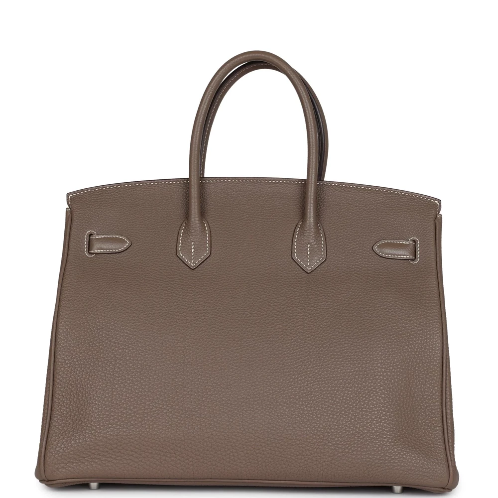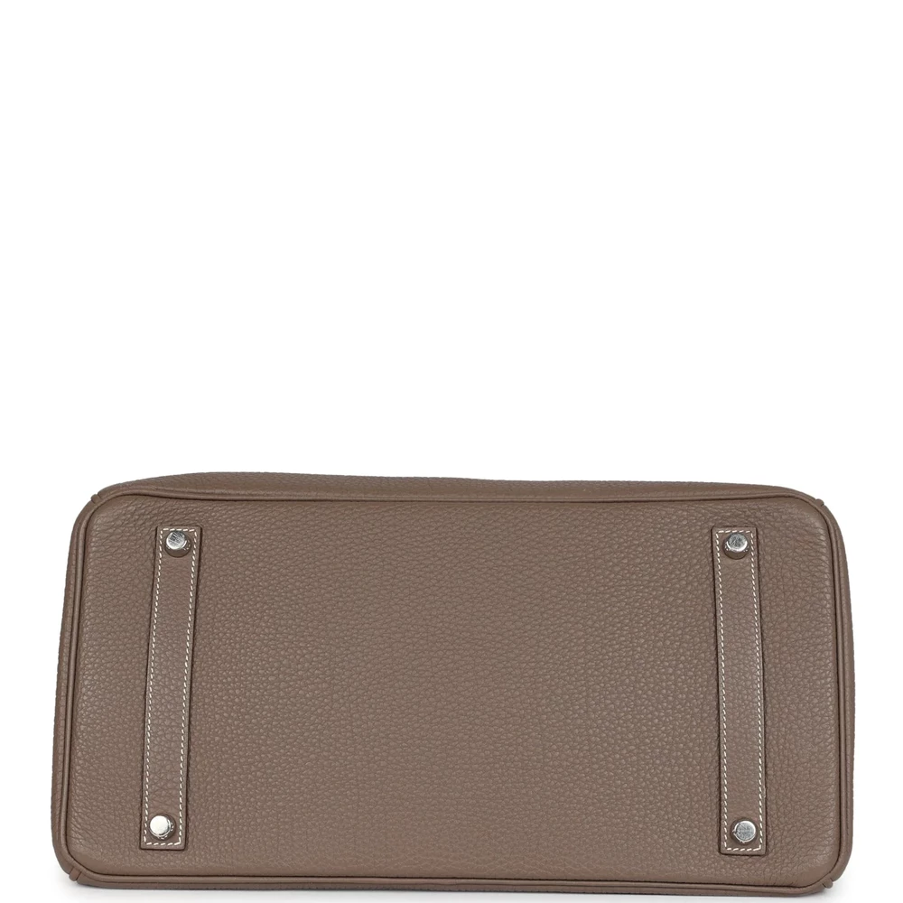 This Hermès Birkin is crafted from Etoupe Togo leather with palladium hardware. It showcases contrast stitching, a front flap with two straps and a center toggle closure, a clochette with lock and two keys, and double rolled handles. The interior is lined with Etoupe chèvre leather and includes one zip pocket with an Hermès-engraved zipper pull and an open pocket on the opposite side. The Togo leather provides both elegance and durability, making it ideal for daily use. The palladium hardware offers a sleek and modern contrast to the soft leather. The spacious interior allows you to carry your essentials with ease.