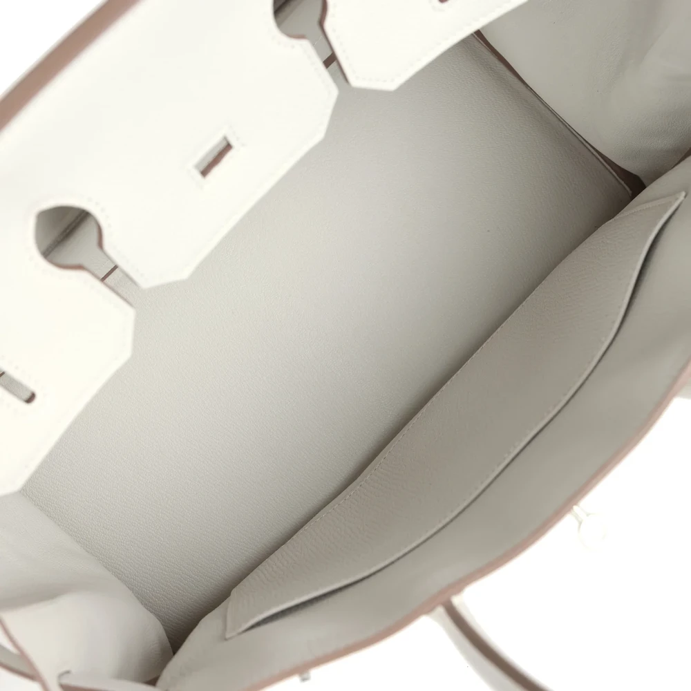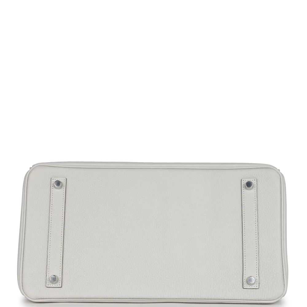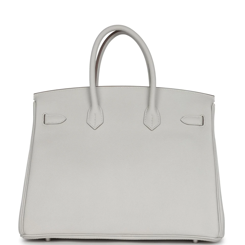 This Hermès Birkin 35 is constructed from Gris Pale Togo leather with palladium hardware, featuring tonal stitching, a front flap, two straps with a center toggle closure, a clochette with lock and two keys, and double rolled handles. The interior is lined with Gris Pale chèvre leather and includes one zip pocket with an Hermès engraved zipper pull and an open pocket on the opposite side. The Togo leather is both durable and luxurious, offering a soft yet sturdy finish. The palladium hardware adds a touch of modern elegance. The interior is spacious enough to hold all your daily necessities with ease.