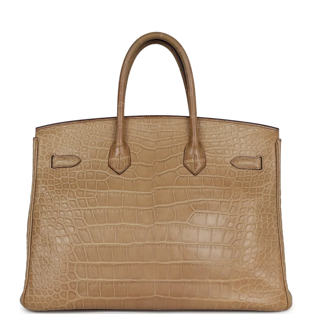 This Hermès Birkin is made from Poussiere matte Alligator leather with palladium hardware, featuring tonal stitching, a front flap with two straps and a center toggle closure, a clochette with lock and two keys, and double rolled handles. The interior is lined with Poussiere chèvre leather and includes one zip pocket with an Hermès-engraved zipper pull and an open pocket on the opposite side.