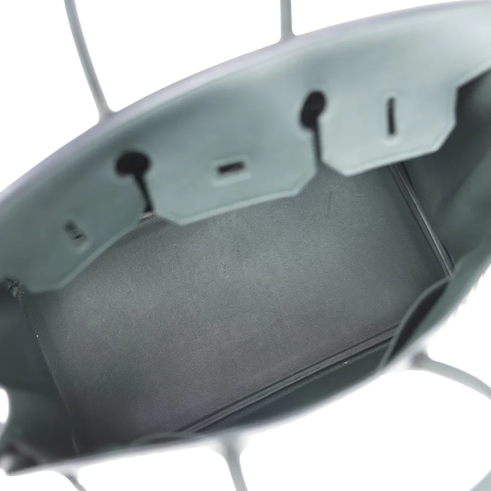 This Hermès Birkin is in Toile Riga and Vert Anglais Swift leather with palladium hardware and has tonal stitching, a front flap, two straps with center toggle closure, a clochette with lock and two keys, and double rolled handles. The interior is lined with Vert Anglais chèvre leather and has one zip pocket with an Hermès-engraved zipper pull and an open pocket on the opposite side.