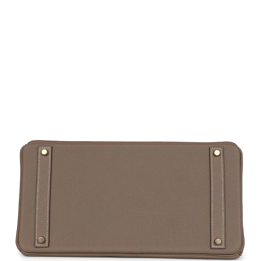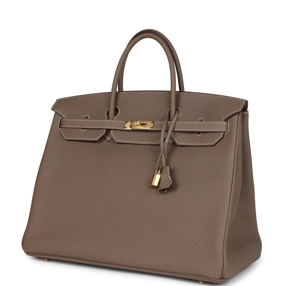 This Hermès Birkin 40 is in Etoupe Togo leather with gold hardware, featuring contrast stitching, a front flap, two straps with a center toggle closure, a clochette with lock and two keys, and double rolled handles. The interior is lined with Etoupe chèvre leather and includes one zip pocket with an Hermès engraved zipper pull and an open pocket on the opposite side. Originating from France, this bag is new and never worn, with plastic on the hardware. The Togo leather offers a soft yet sturdy finish. The gold hardware adds a luxurious touch to the design. The interior is designed to accommodate all your essentials with ease.