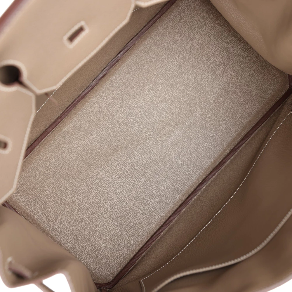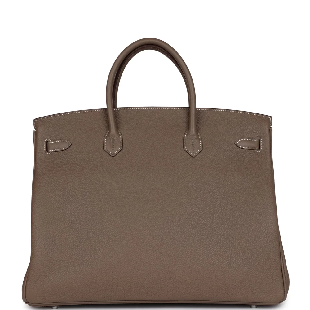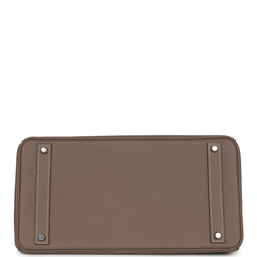 This Hermès Birkin 40 is made from Etoupe Togo leather with palladium hardware and features contrast stitching, a front flap, two straps with a center toggle closure, a clochette with lock and two keys, and double rolled handles. The interior is lined with Etoupe chèvre leather, offering one zip pocket with an Hermès engraved zipper pull and an open pocket on the opposite side. Originating from France, this bag is in new and never worn condition, with plastic on the hardware. The Togo leather provides a durable and luxurious finish. The spacious interior is perfect for daily use or travel.