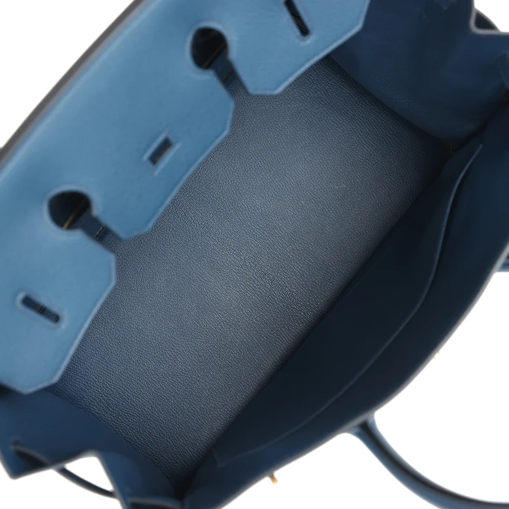 This Hermès Birkin is crafted from Bleu de Prusse Togo leather with gold hardware, featuring tonal stitching, a front flap with two straps and a center toggle closure, a clochette with lock and two keys, and double rolled handles. The interior is lined with Bleu de Prusse chèvre leather and includes one zip pocket with an Hermès-engraved zipper pull and an open pocket on the opposite side.