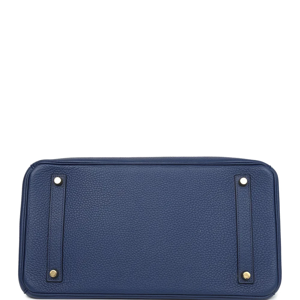 This Hermès Birkin is fashioned from Bleu Saphir Clemence leather with gold hardware, featuring tonal stitching, a front flap with two straps and a center toggle closure, a clochette with lock and two keys, and double rolled handles. The interior is lined with Bleu Saphir chèvre leather and includes one zip pocket with an Hermès-engraved zipper pull and an open pocket on the opposite side.