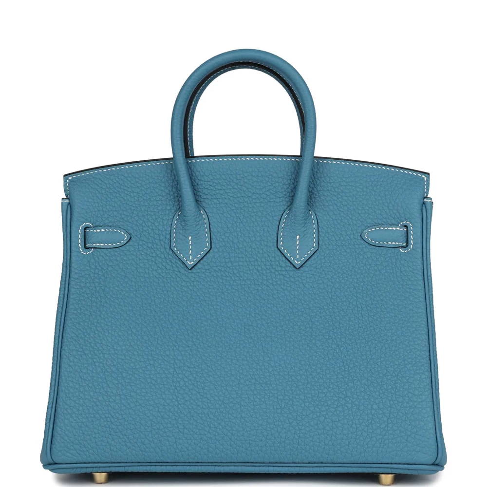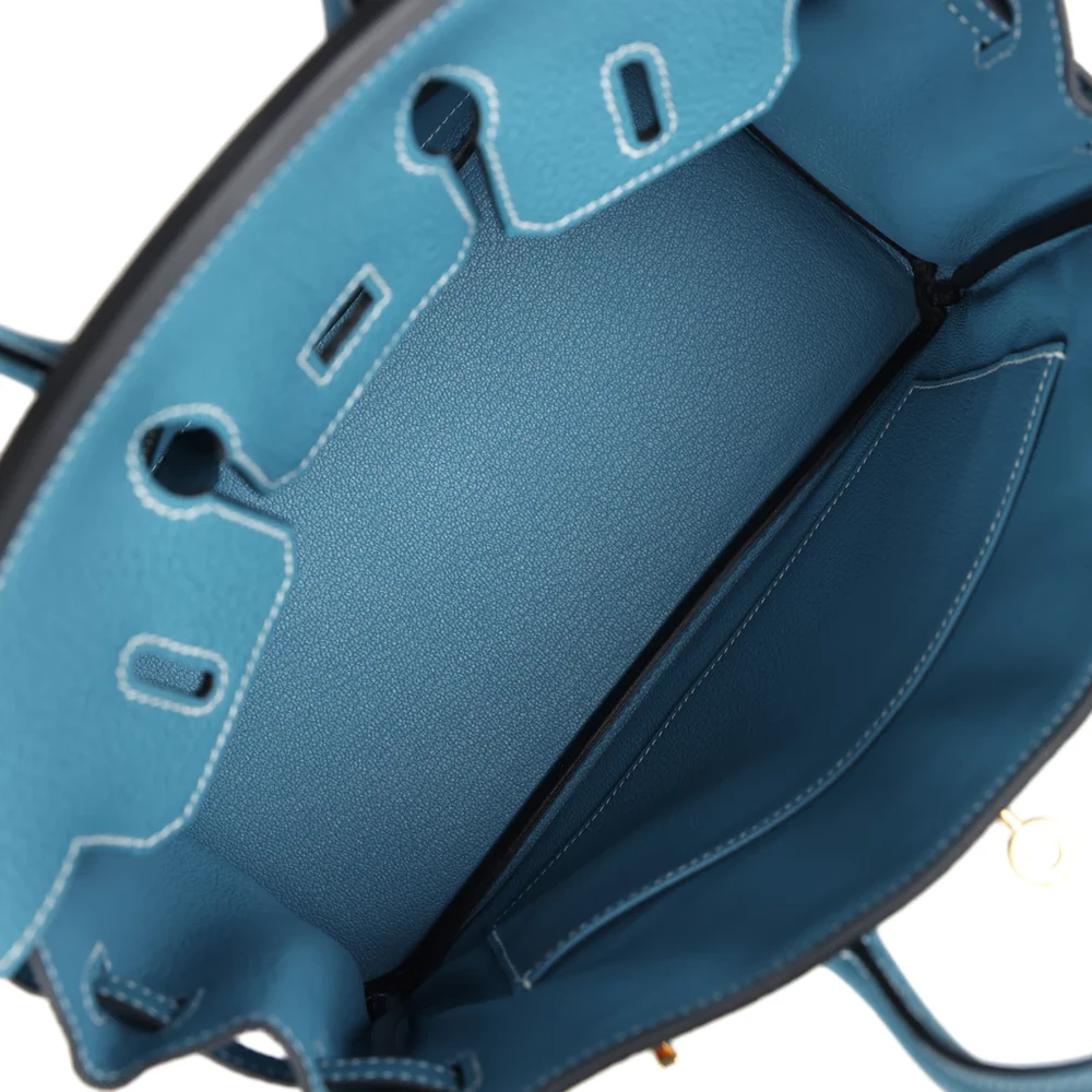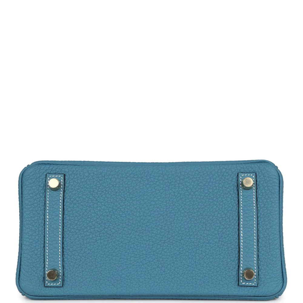This Hermès Birkin is crafted from Blue Jean Togo leather with gold hardware, featuring contrast stitching, a front flap with two straps and a center toggle closure, a clochette with lock and two keys, and double rolled handles. The interior is lined with Blue Jean chèvre leather and includes one zip pocket with an Hermès-engraved zipper pull and an open pocket on the opposite side.
