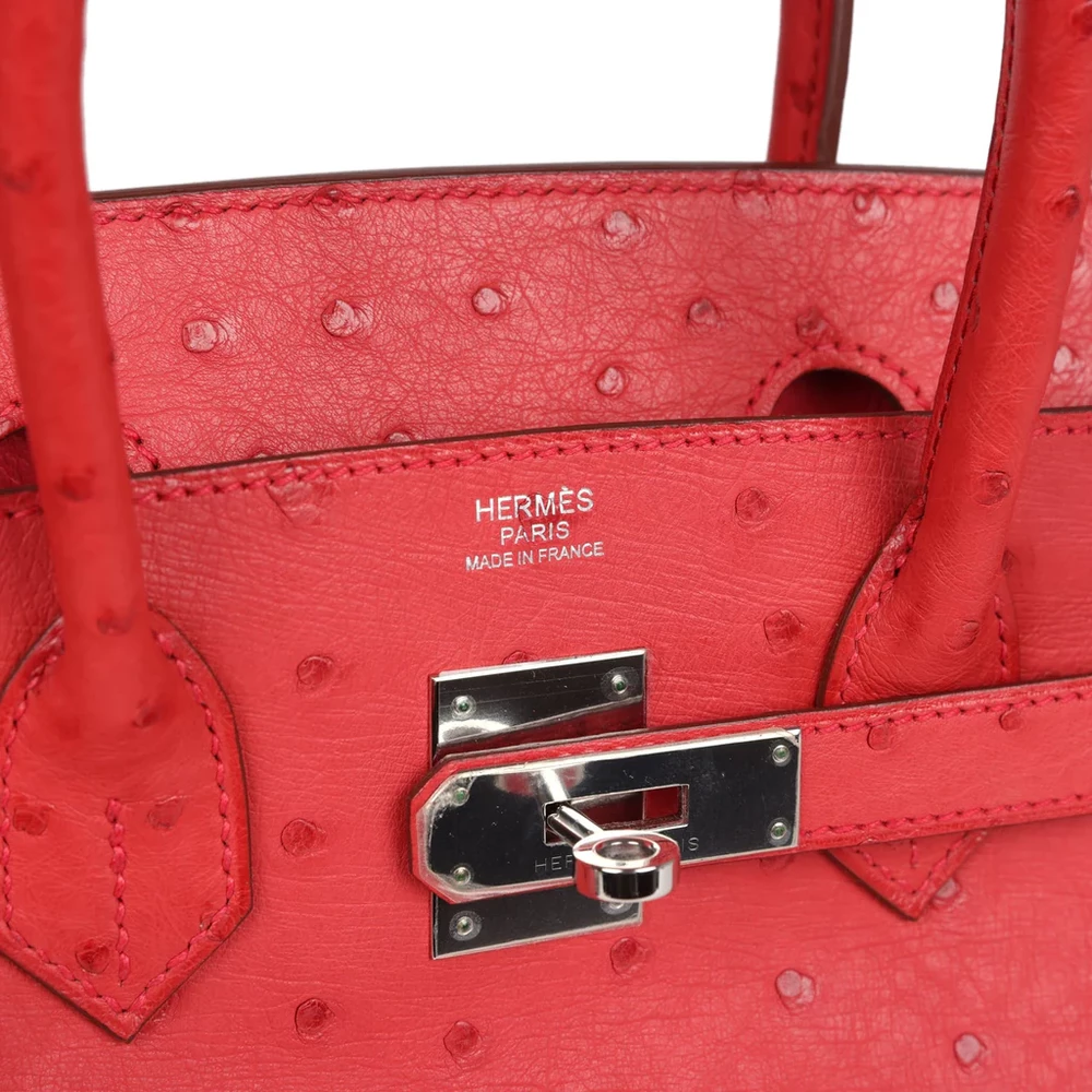 This Hermès Birkin is crafted from Bougainvillea Ostrich leather with palladium hardware, offering a unique and sophisticated design. The bag features tonal stitching, a front flap with two straps, and a center toggle closure for secure fastening. A clochette with a lock and two keys enhances the bag’s elegance, while the double rolled handles ensure comfort while carrying. The interior is lined with Bougainvillea Chevre leather, providing a smooth, luxurious touch. It includes one zip pocket with an Hermès engraved zipper pull and an open pocket on the opposite side for convenient storage.