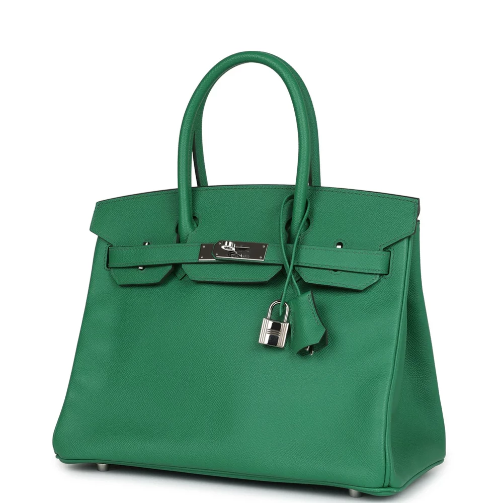 This Hermès Birkin is fashioned from Cactus Epsom leather with palladium hardware, featuring tonal stitching, a front flap with two straps, a center toggle closure, a clochette with lock and two keys, and double rolled handles. The interior is lined with Cactus chèvre leather and includes one zip pocket with an Hermès-engraved zipper pull and an open pocket on the opposite side.