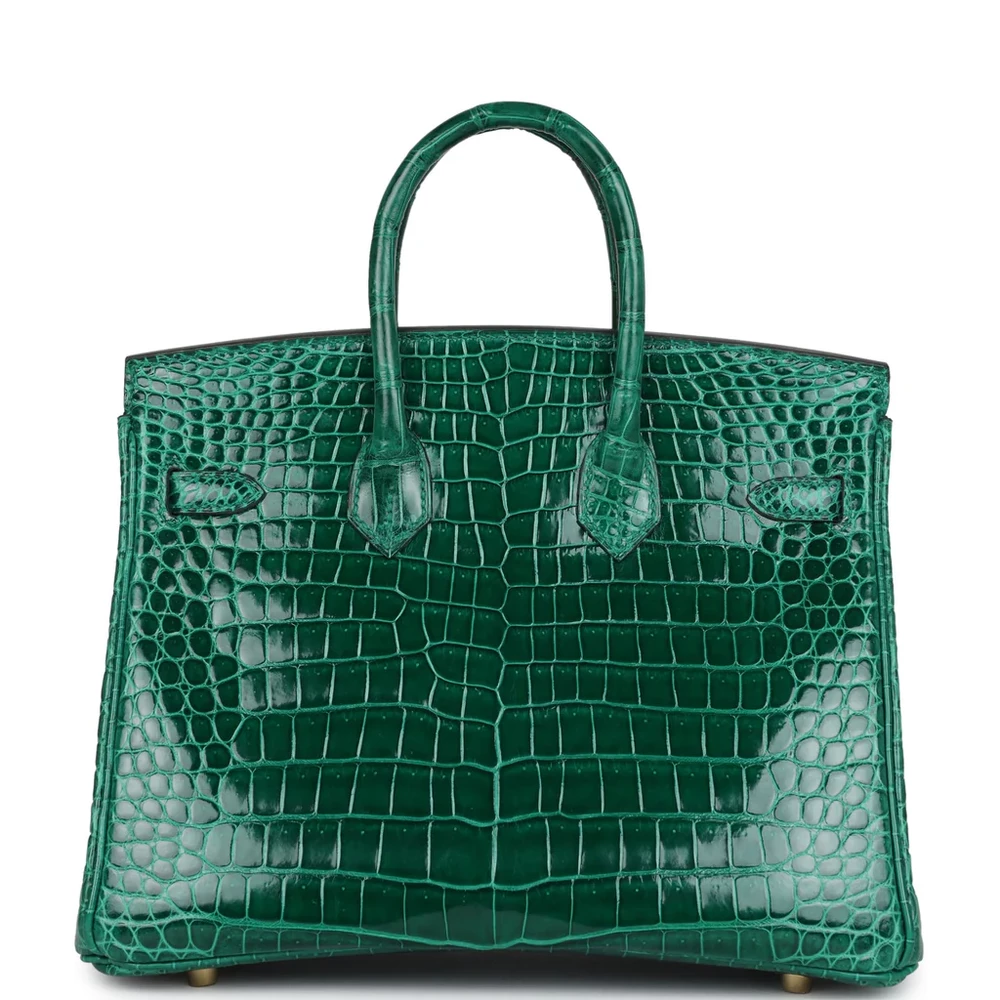 This Hermès Birkin is fashioned from Vert Emeraude shiny Porosus crocodile leather with gold hardware, featuring tonal stitching, a front flap with two straps, a center toggle closure, a clochette with lock and two keys, and double rolled handles. The interior is lined with Vert Emeraude chèvre leather and includes one zip pocket with an Hermès-engraved zipper pull and an open pocket on the opposite side.