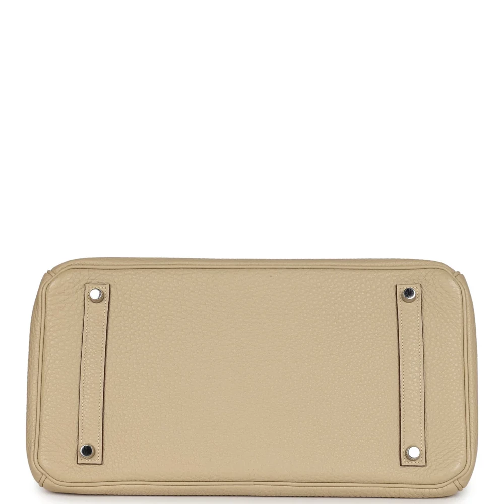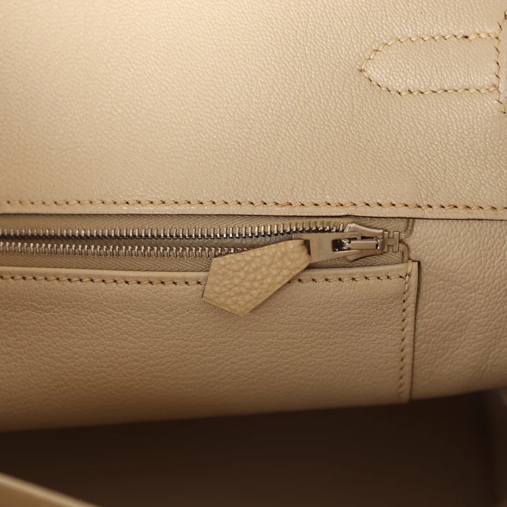 This Hermès Birkin is made from Parchemin Togo leather with palladium hardware, offering a refined and elegant look. The bag features tonal stitching, a front flap with two straps, and a front toggle closure for added security. A clochette with a lock and two keys is included, along with double rolled handles for easy carrying. The interior is lined with Parchemin Chevre leather, providing a soft, premium finish. One zip pocket with an Hermès engraved zipper pull and an open pocket on the opposite side ensure organized storage.