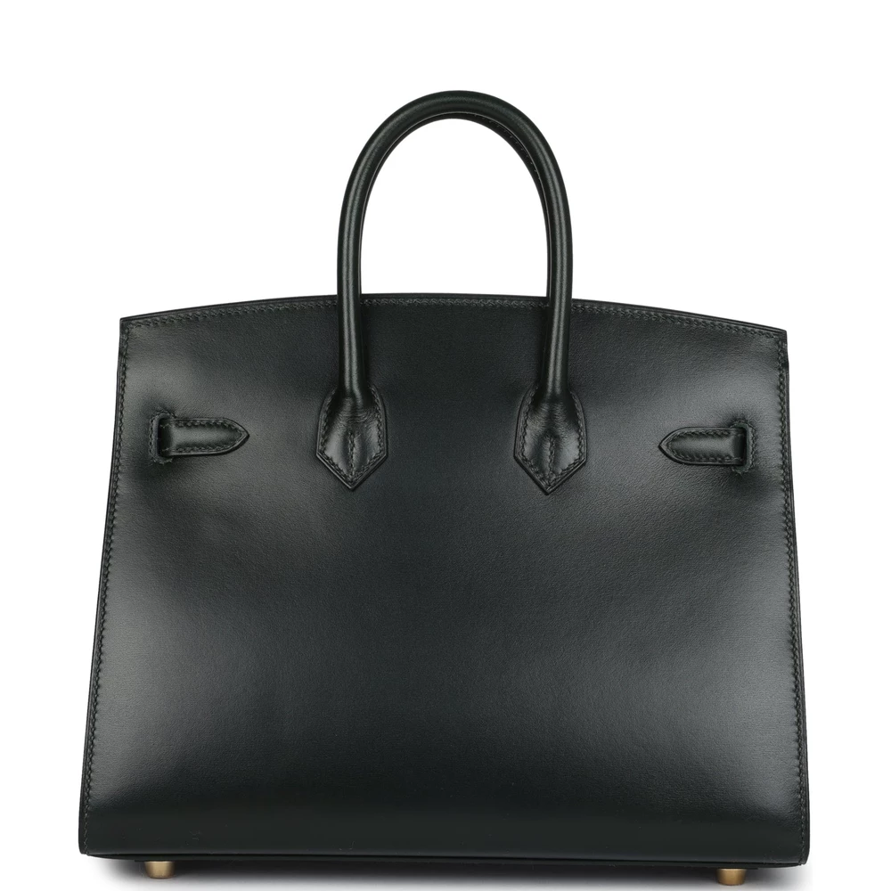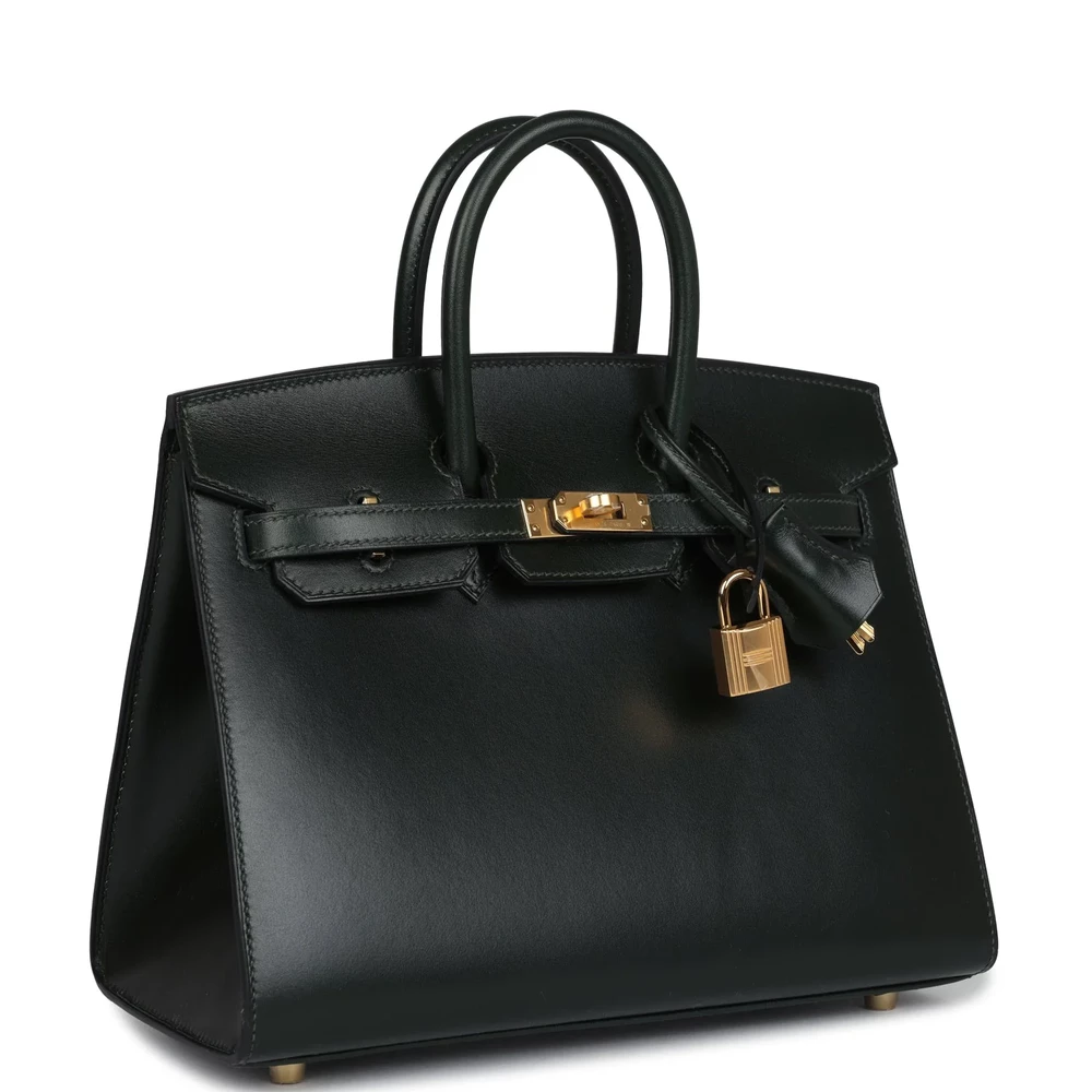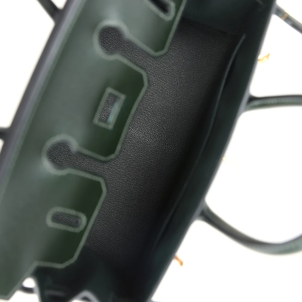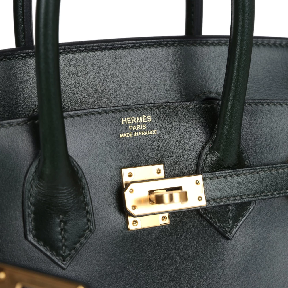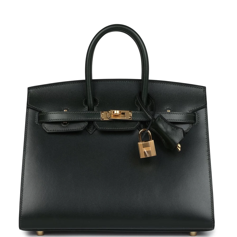 This Hermès Birkin Sellier is fashioned from Vert Foncé Box leather with gold hardware, featuring tonal stitching, a front flap with two straps and a center toggle closure, a clochette with lock and two keys, and double rolled handles. The interior is lined with Vert Foncé chèvre leather and includes one zip pocket with an Hermès-engraved zipper pull and an open pocket on the opposite side.