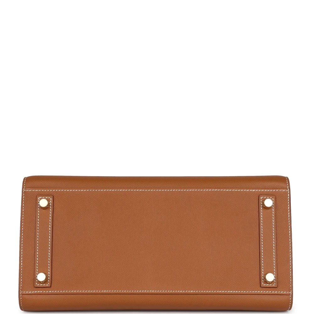 This Hermès Birkin is crafted from Gold Epsom leather with gold hardware. It features contrast stitching, a front flap with two straps and a center toggle closure, a clochette with lock and two keys, and double rolled handles. The interior is lined with Gold chèvre leather and includes one zip pocket with an Hermès-engraved zipper pull and an open pocket on the opposite side. The Epsom leather provides a structured, crisp look while remaining lightweight and durable. The gold hardware provides a glamorous touch to the classic design. The interior pockets allow for easy organization and quick access to your essentials.