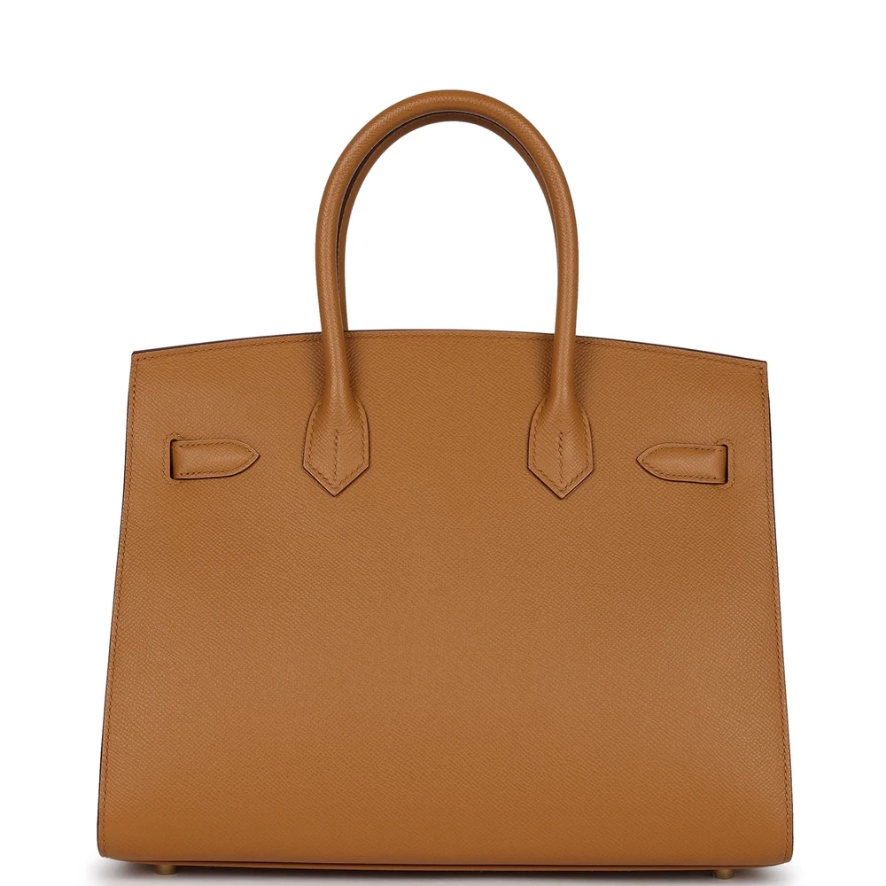 This Hermès Birkin Sellier is crafted from Sesame Epsom leather with gold hardware, featuring tonal stitching, a front flap with two straps and a center toggle closure, a clochette with lock and two keys, and double rolled handles. The interior is lined with Sesame chèvre leather and includes one zip pocket with an Hermès-engraved zipper pull and an open pocket on the opposite side.