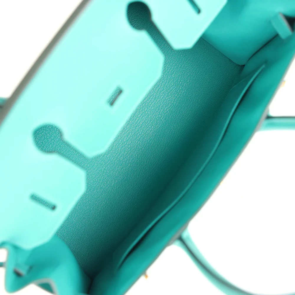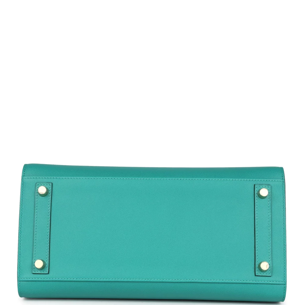 This Hermès Birkin is crafted from Vert Verone Madame leather with gold hardware, featuring tonal stitching, a front flap with two straps and a center toggle closure, a clochette with lock and two keys, and double rolled handles. The interior is lined with Vert Verone chèvre leather and includes one zip pocket with an Hermès-engraved zipper pull and an open pocket on the opposite side.