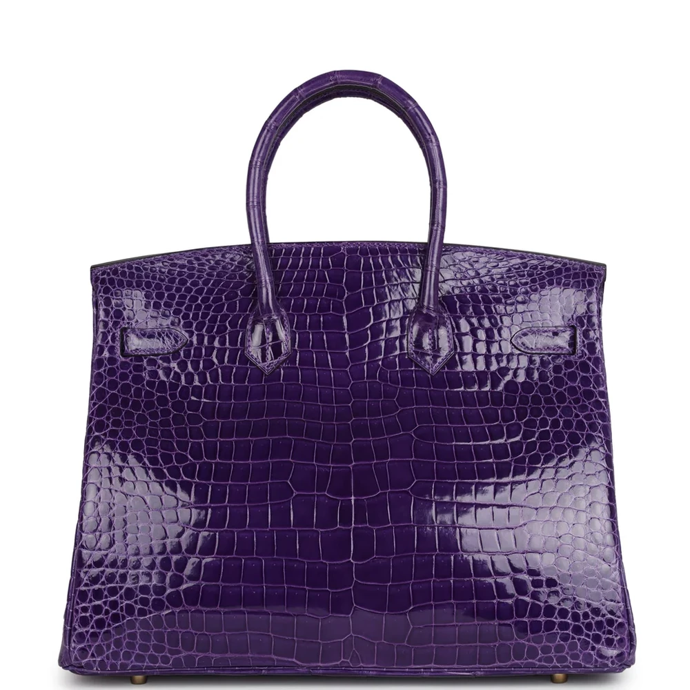 This Hermès Birkin is crafted from Ultraviolet Shiny Porosus Crocodile leather with gold hardware, offering an exotic and refined design. The bag features tonal stitching, a front flap with two straps, and a center toggle closure for secure fastening. A clochette with a lock and two keys ensures your belongings are safe, while the double rolled handles provide comfort while carrying. The interior is lined with Ultraviolet Chevre leather, providing a luxurious and smooth finish. It includes one zip pocket with an Hermès engraved zipper pull and an open pocket on the opposite side for convenient organization.