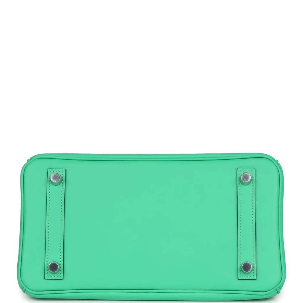 This Hermès Birkin is crafted from Vert Comics Swift leather with palladium hardware, featuring tonal stitching, a front flap with two straps, a center toggle closure, a clochette with lock and two keys, and double rolled handles. The interior is lined with Vert Comics chèvre leather and includes one zip pocket with an Hermès-engraved zipper pull and an open pocket on the