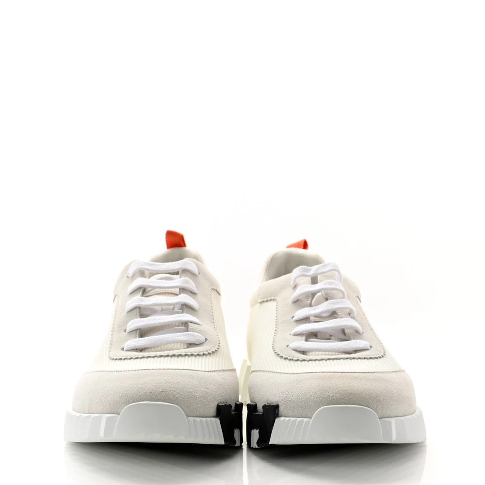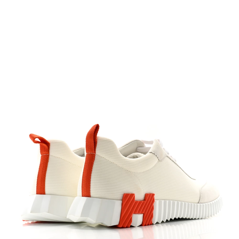 This Hermès Bouncing sneaker in White Orange technical canvas and Suede & Goatskin is a sporty yet luxurious choice. The lightweight fabric ensures breathability, while suede accents add a refined touch. Featuring a cushioned sole for all-day comfort, it blends function with fashion. Whether paired with athletic wear or relaxed casual looks, this sneaker offers modern appeal.