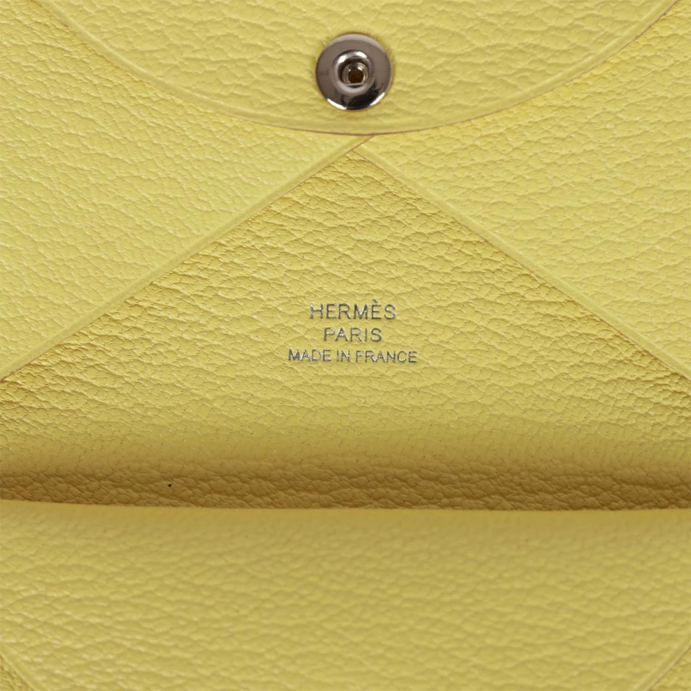 This Hermès Calvi Duo Compact Card Holder in Limoncello is a bright and sophisticated accessory for everyday essentials. Crafted from Chèvre Mysore leather, its fine grain and supple texture enhance the cheerful yellow tone. The minimalist design features an envelope-style closure secured by a discreet snap, while the duo-compartment interior provides organized storage for cards and small essentials. Lightweight and effortlessly chic, this cardholder is a refined addition to any collection.