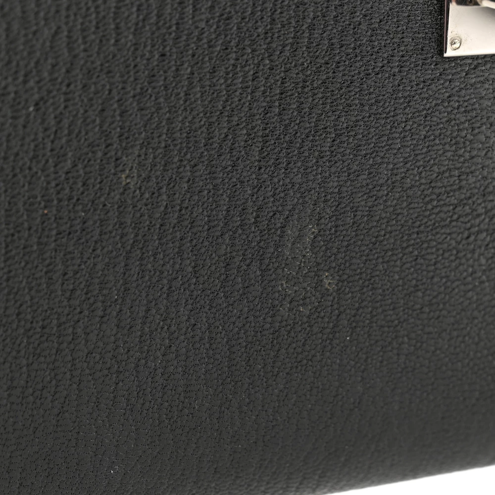 This Hermès Chevre Mysore Kelly Wallet To Go in Black is a timeless expression of elegance and functionality. Expertly crafted from luxurious Chevre Mysore goatskin leather, it showcases a refined black hue with a subtle sheen. The design features a classic front flap, a matching leather strap, and the iconic Kelly palladium-plated turn-lock closure. The interior opens to a partitioned black leather layout, offering zipper and patch pockets for organized storage. Sophisticated and versatile, this wallet is perfect for effortless day-to-night transitions
