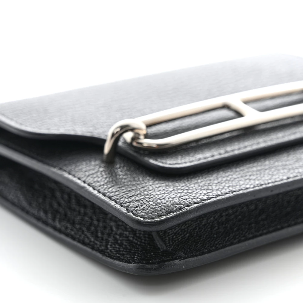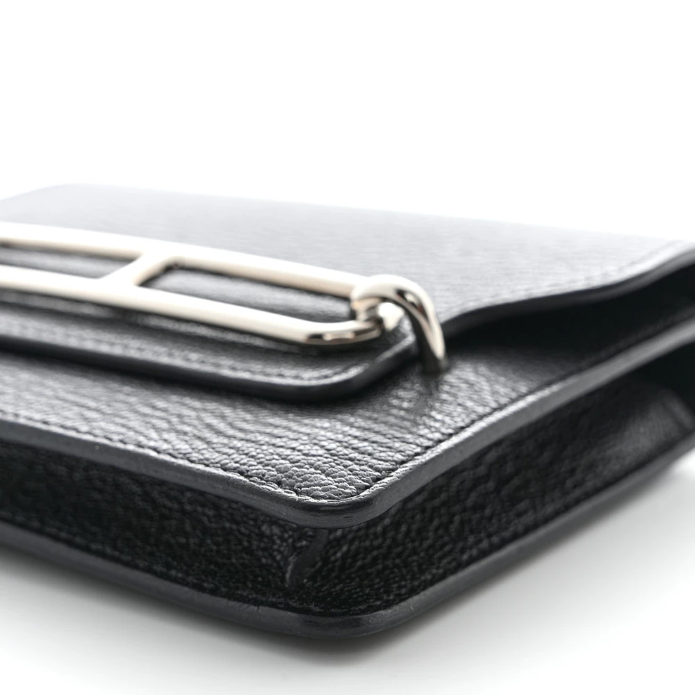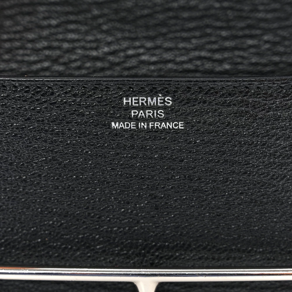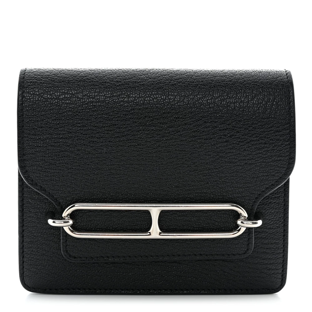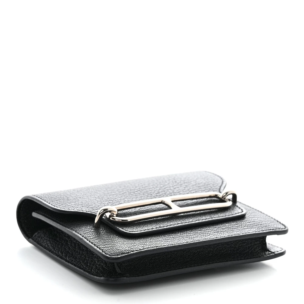 This Hermès Chevre Mysore Roulis Slim Wallet in Black embodies understated elegance. Crafted from luxurious Chevre Mysore goatskin leather, it features a sleek palladium-plated ‘H’ clasp that opens to a refined black leather interior. The thoughtfully designed interior includes card slots and a removable zipper pocket insert for versatile organization. Compact and sophisticated, this wallet is a timeless accessory that reflects Hermès’ impeccable craftsmanship.