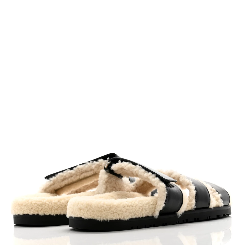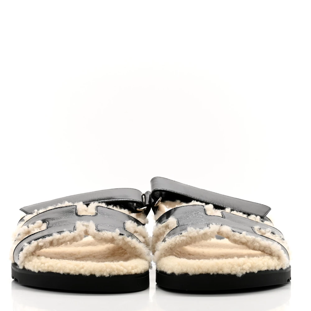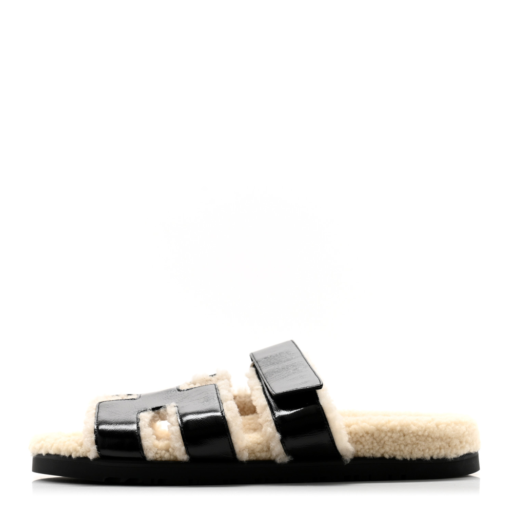 This Hermès Chypre sandal in Black Ecru glazed nappa leather and woolskin is a cozy yet elevated take on a classic design. The plush wool lining provides warmth and texture, while the glossy nappa leather adds a luxurious contrast. Designed for comfort, it blends casual ease with refined aesthetics. Whether worn with relaxed outfits or statement pieces, this sandal is a unique wardrobe staple.