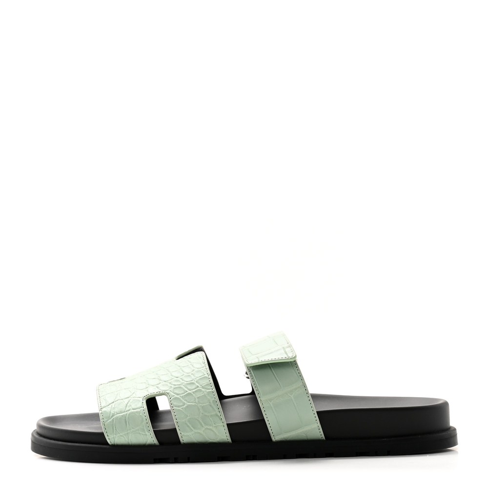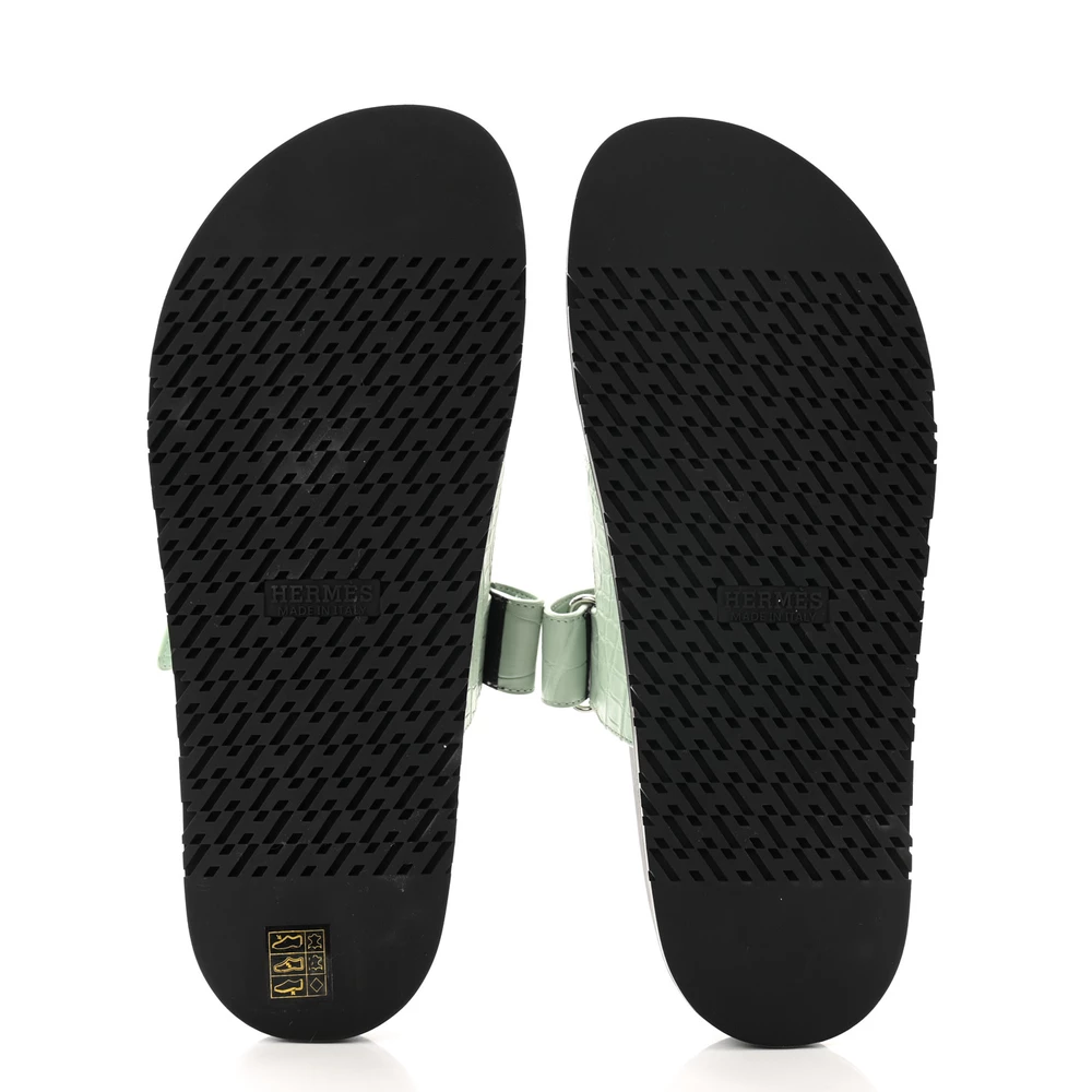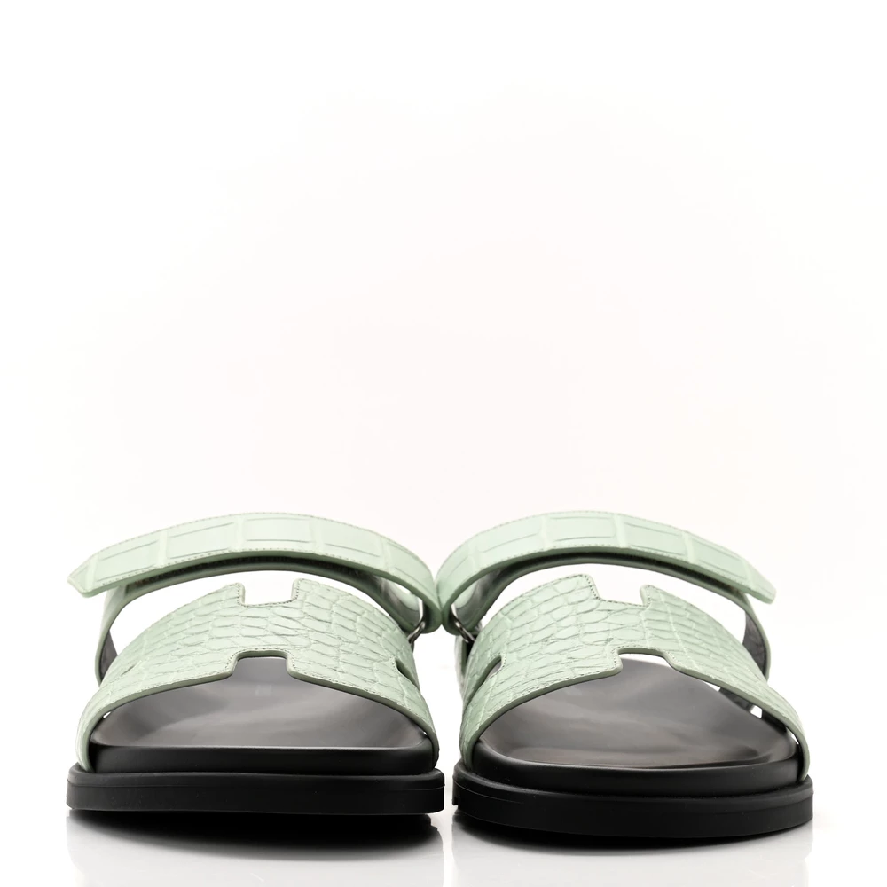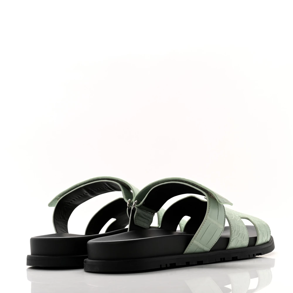 This Hermès Chypre sandal in Vert d’Eau matte alligator is a luxurious take on a sporty design. The exotic leather enhances its exclusivity, while the ergonomic sole ensures supreme comfort. Designed with an adjustable strap for a secure fit, it offers both style and practicality. Whether worn casually or to elevate a laid-back look, this sandal exudes refined sophistication.