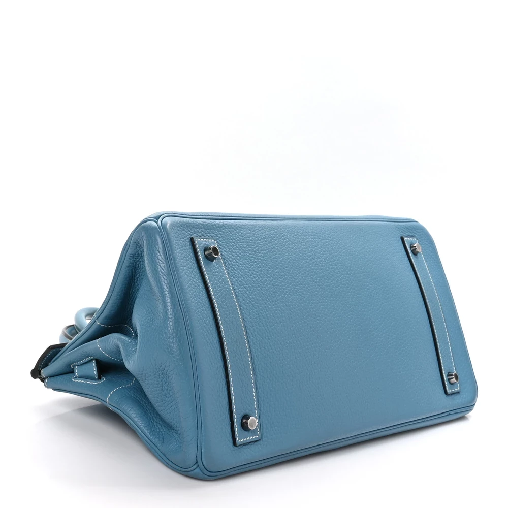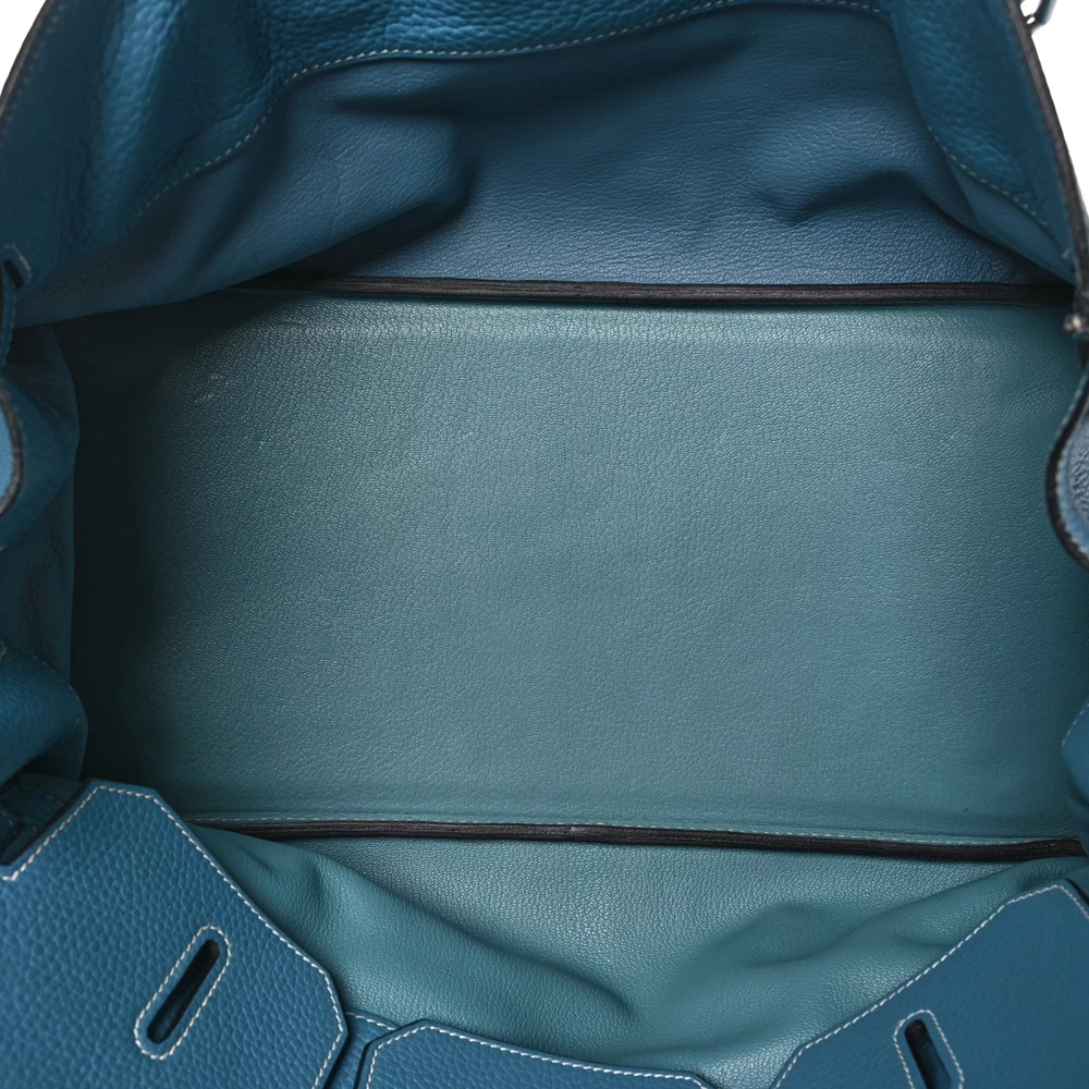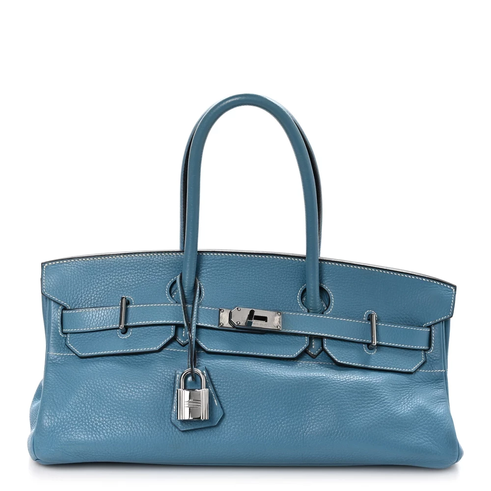 This Hermès Taurillon Clémence JPG Birkin 42 in Blue Jean is a relaxed and oversized handbag with a unique elongated design. The soft Clémence leather allows for a slightly slouchy silhouette, making it both stylish and functional. The cool Blue Jean shade is enhanced by white contrast stitching, adding a signature Hermès touch. Palladium hardware complements the design, making this a rare and practical statement piece.