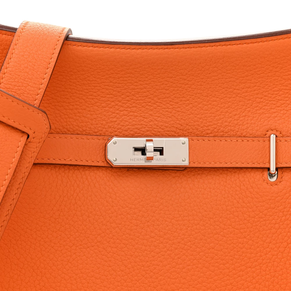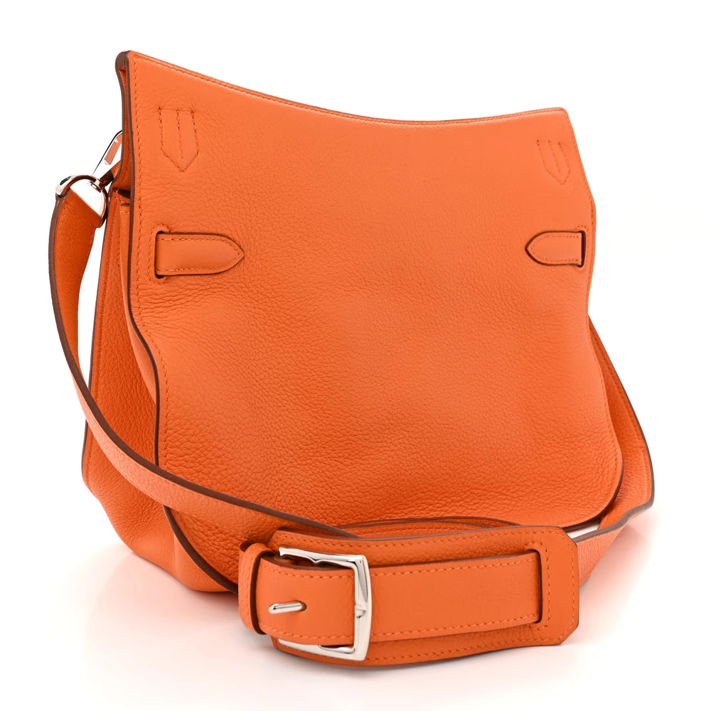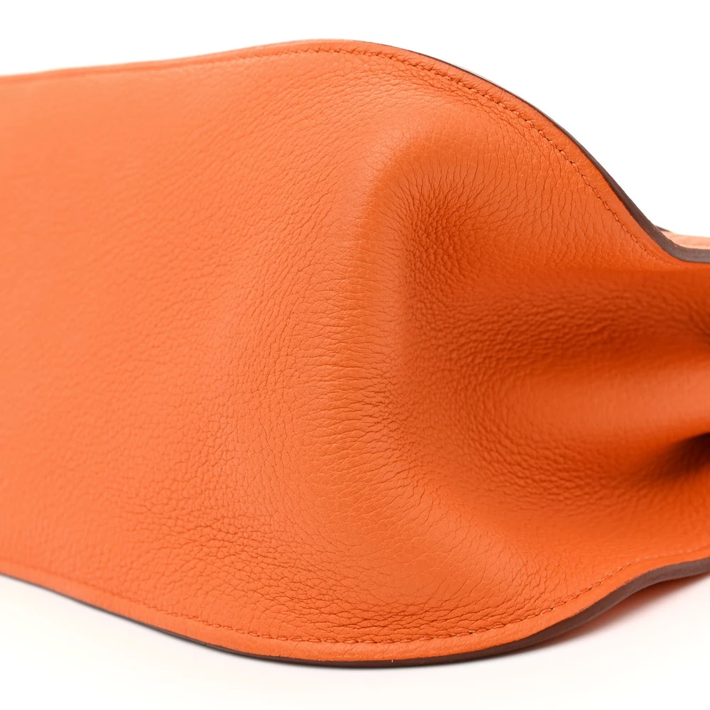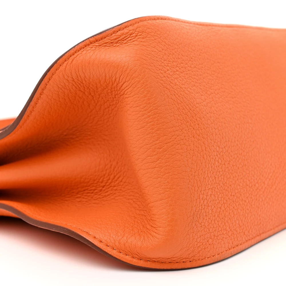 This Hermès Jypsiere 28 in Orange Taurillon Clemence Leather is a bold and striking messenger-style bag. The Clemence leather provides a soft, relaxed feel while maintaining durability. Its vibrant orange shade adds a lively touch, complemented by sleek silver-tone hardware. The adjustable strap enhances its practicality, making it a statement piece for both casual and sophisticated looks.