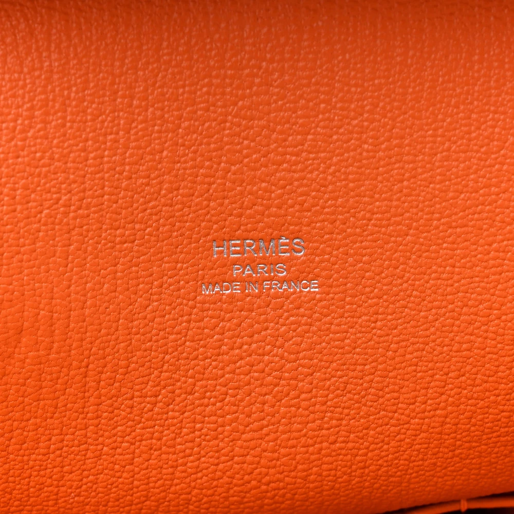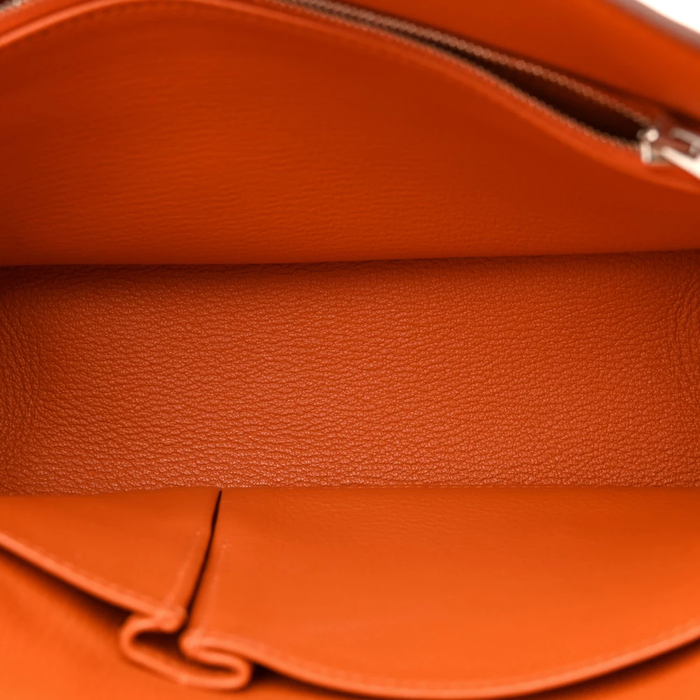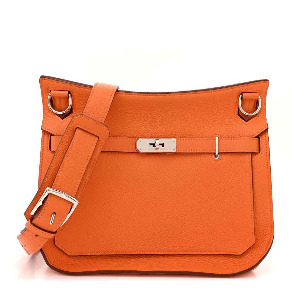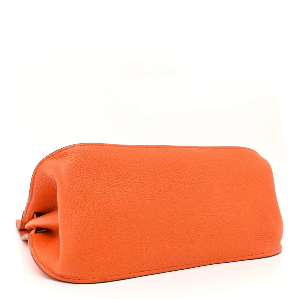 This Hermès Jypsiere 28 in Orange Taurillon Clemence Leather is a bold and striking messenger-style bag. The Clemence leather provides a soft, relaxed feel while maintaining durability. Its vibrant orange shade adds a lively touch, complemented by sleek silver-tone hardware. The adjustable strap enhances its practicality, making it a statement piece for both casual and sophisticated looks.