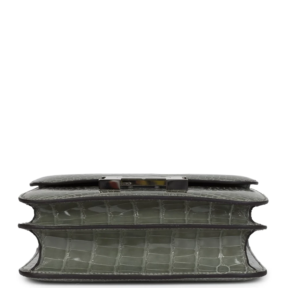 This Hermès Constance 18 in Gris Ciment Shiny Alligator leather is a luxurious and striking piece, enhanced by palladium hardware. Its unique gray hue and glossy finish make it a standout accessory for any occasion. Perfect for those who appreciate bold yet timeless pieces, it is a true reflection of Hermès’ craftsmanship and sophistication.