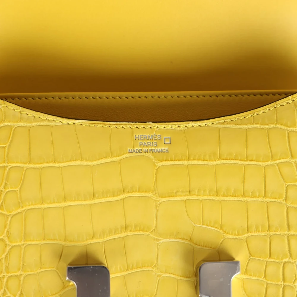 This Hermès Constance 18 in Mimosa Matte Alligator is a rare blend of vibrance and sophistication. The matte alligator texture enhances its exotic and luxurious appeal. Palladium hardware provides a modern, cool-toned contrast. Compact yet striking, ideal for both casual and statement styling. A perfect choice for collectors who appreciate unique and vibrant luxury. Elevate your collection with this radiant and rare Hermès masterpiece.