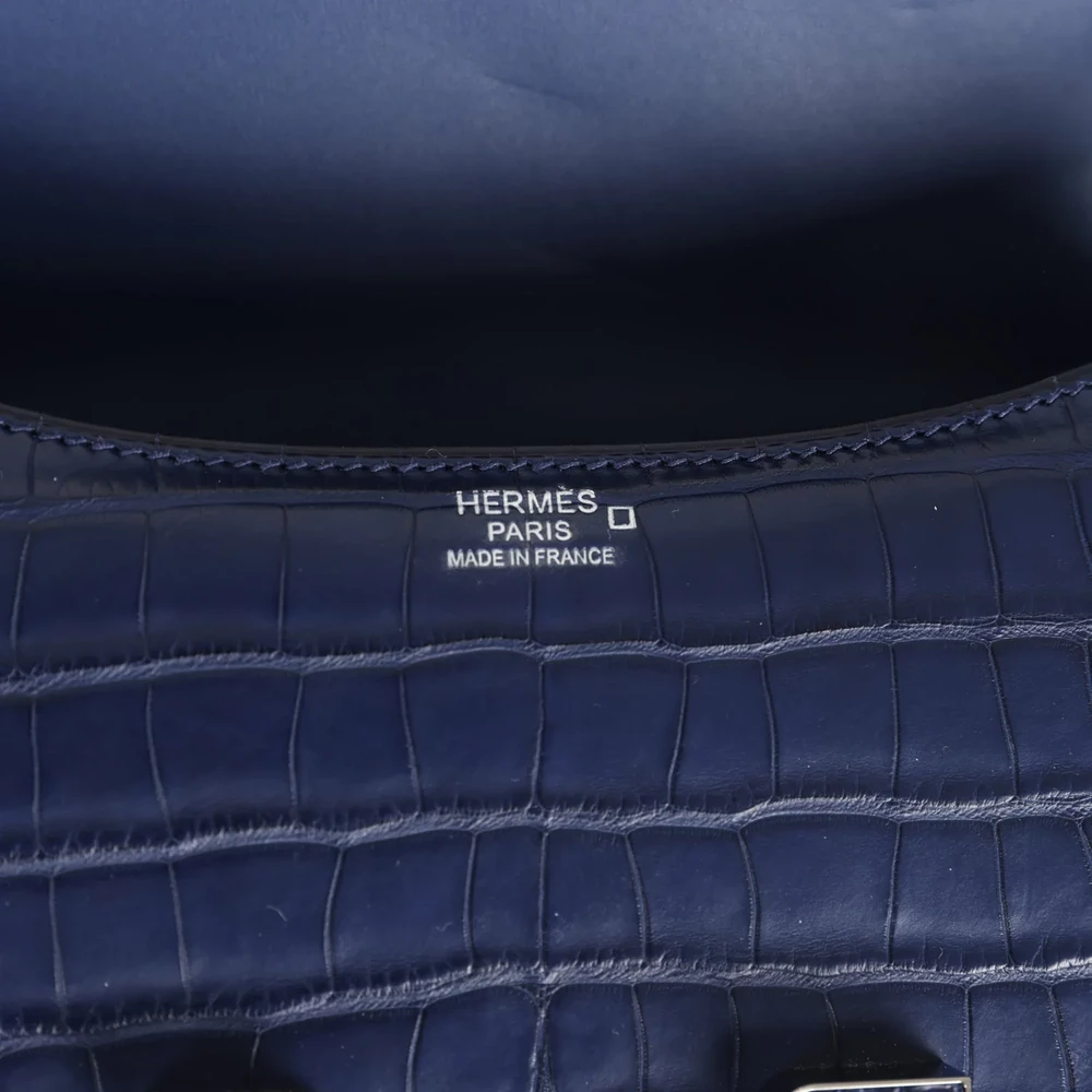 This Hermès Constance 1-24 in Bleu Saphir Matte Alligator is a masterpiece of deep, rich elegance. The matte alligator finish enhances its luxurious and refined texture. Marquette Palladium hardware adds a strikingly modern and unique touch. Spacious and structured, ideal for both sophistication and practicality. A collector’s dream for those who appreciate rare and timeless beauty. Elevate your collection with this deep sapphire-toned Constance.